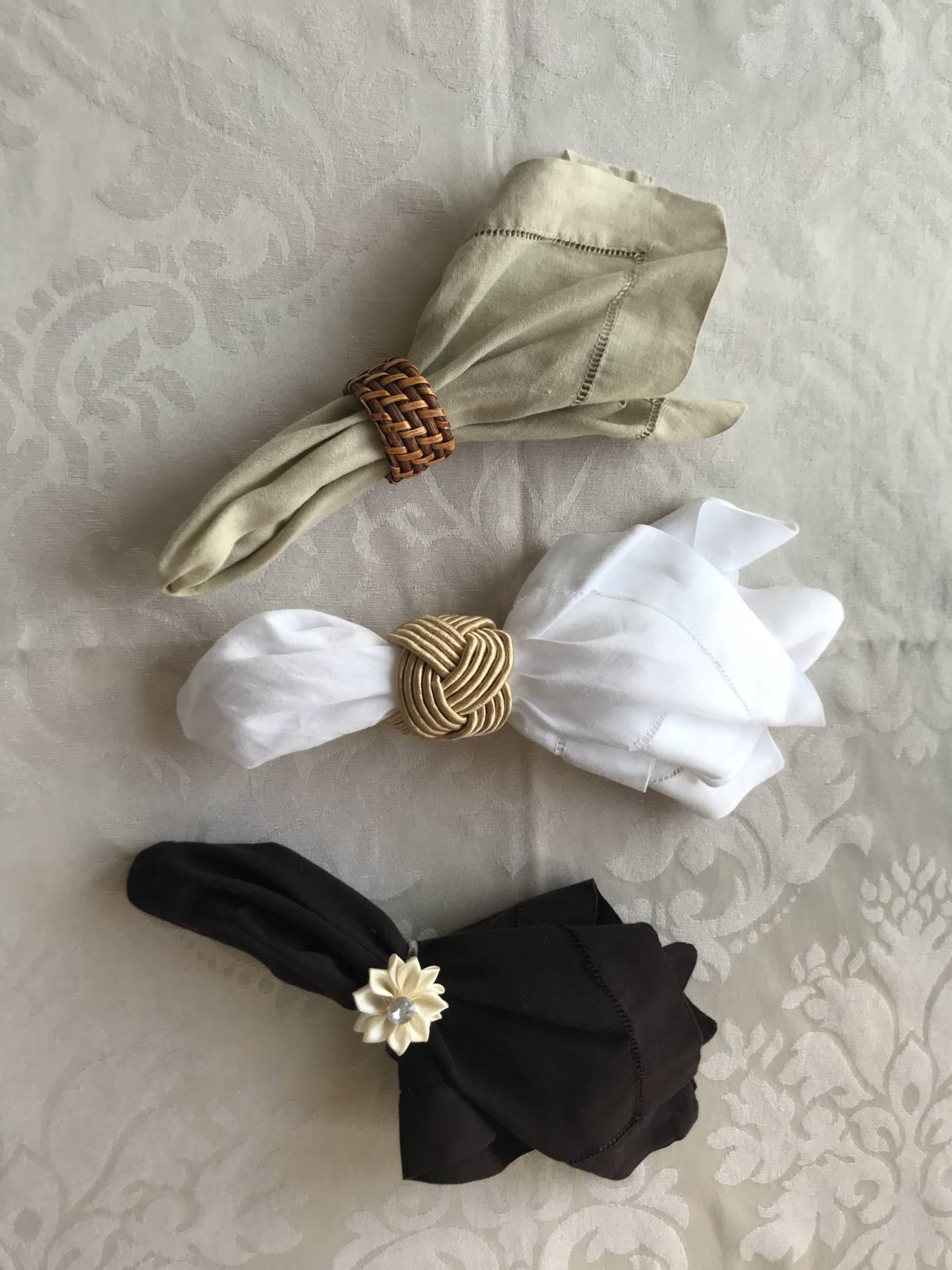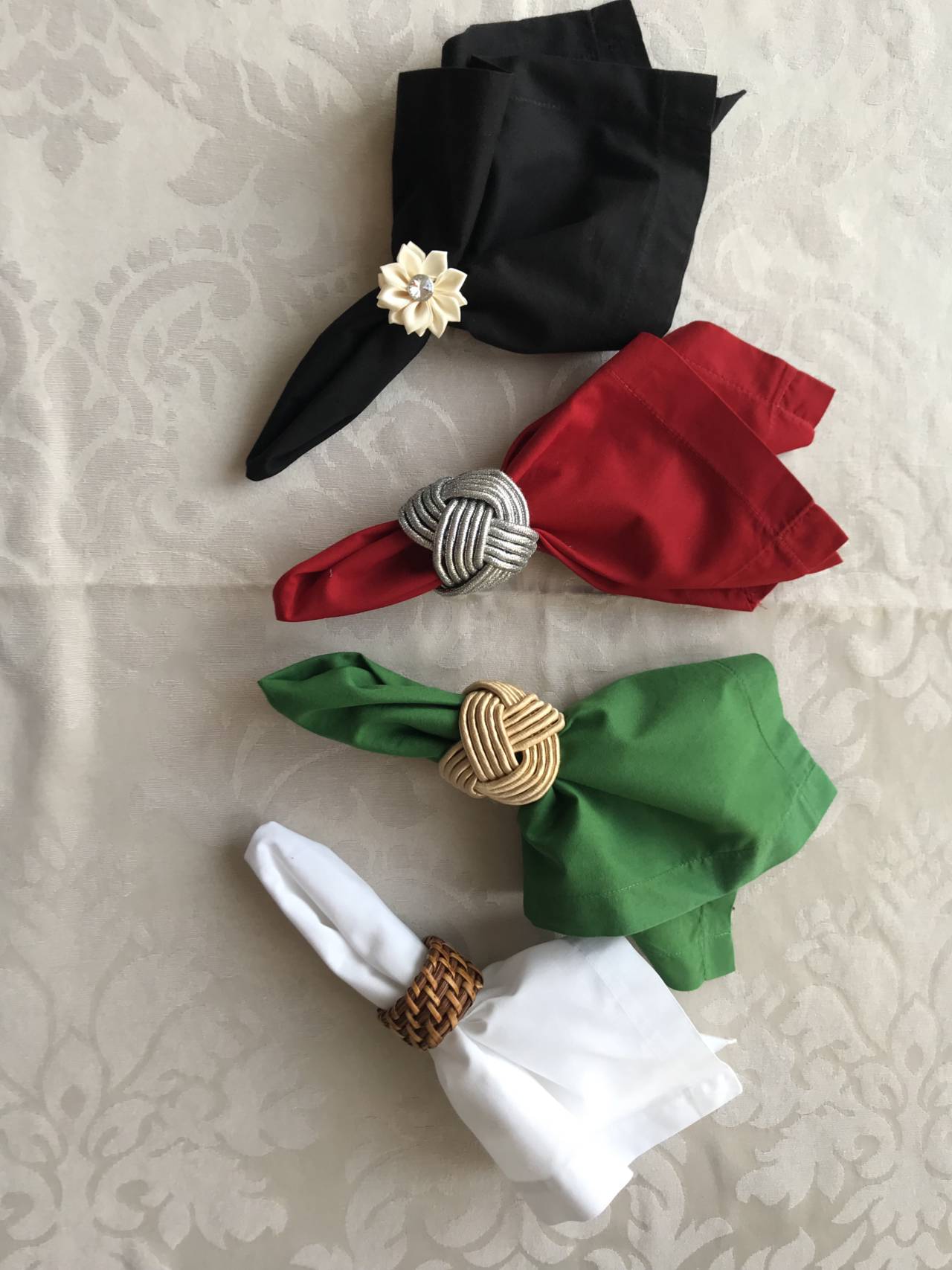 São usados dois tipos de matéria-prima para confeccioná-los e cada um destes materiais tem relação direta ao local/evento em que é utilizado. Em ambientes de muita formalidade, utiliza-se guardanapo fabricado em tecido, podendo ser um pano liso ou estampado e geralmente é acompanhado de um acessório: uma argolas ou fitas de cetim, ou um anel metálico.