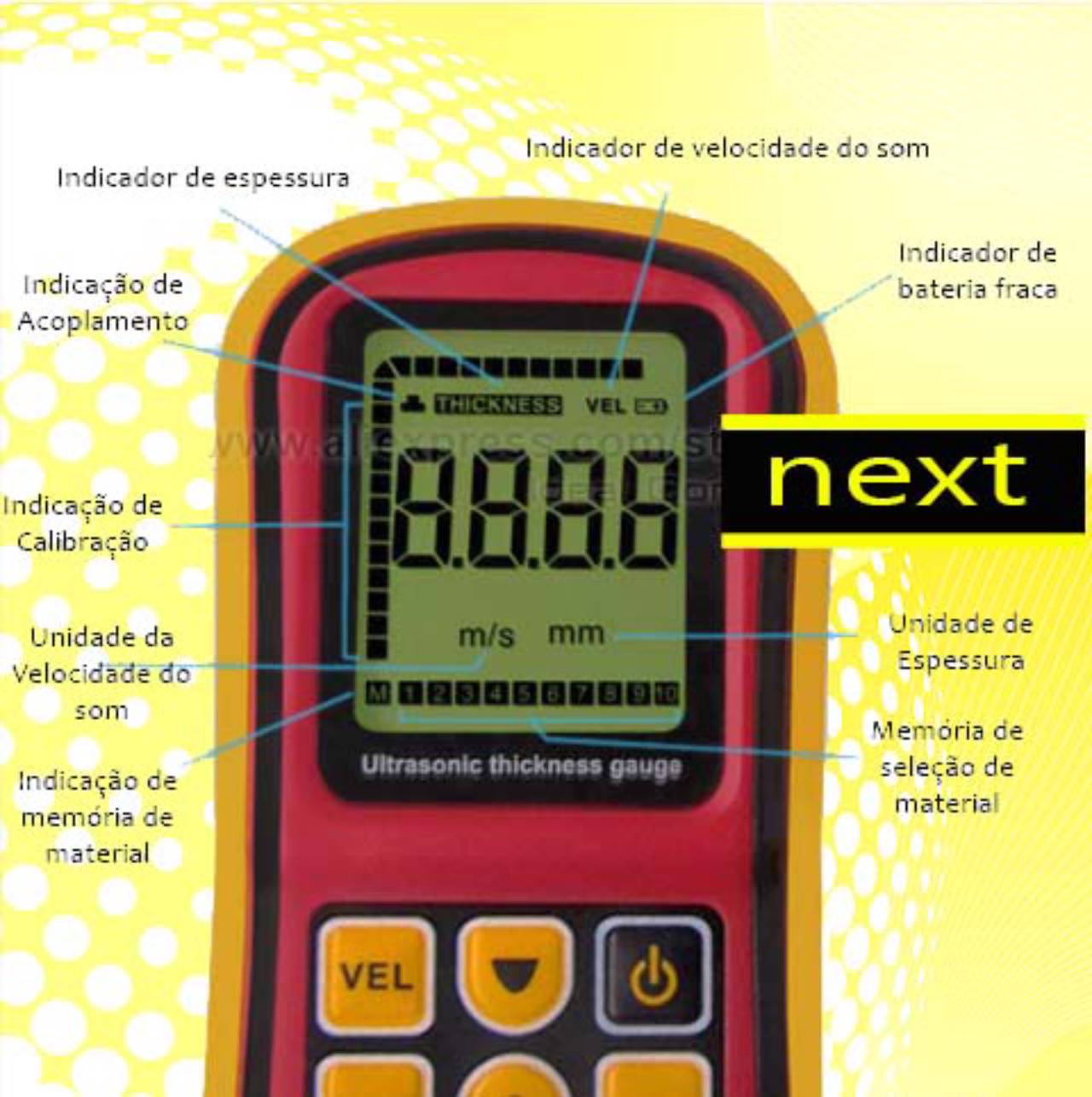 10 ESPESSURAS MEDIÇÃO CONFIGURÁVEIS E FUNÇÃO DE RECALL DISPONÍVEL