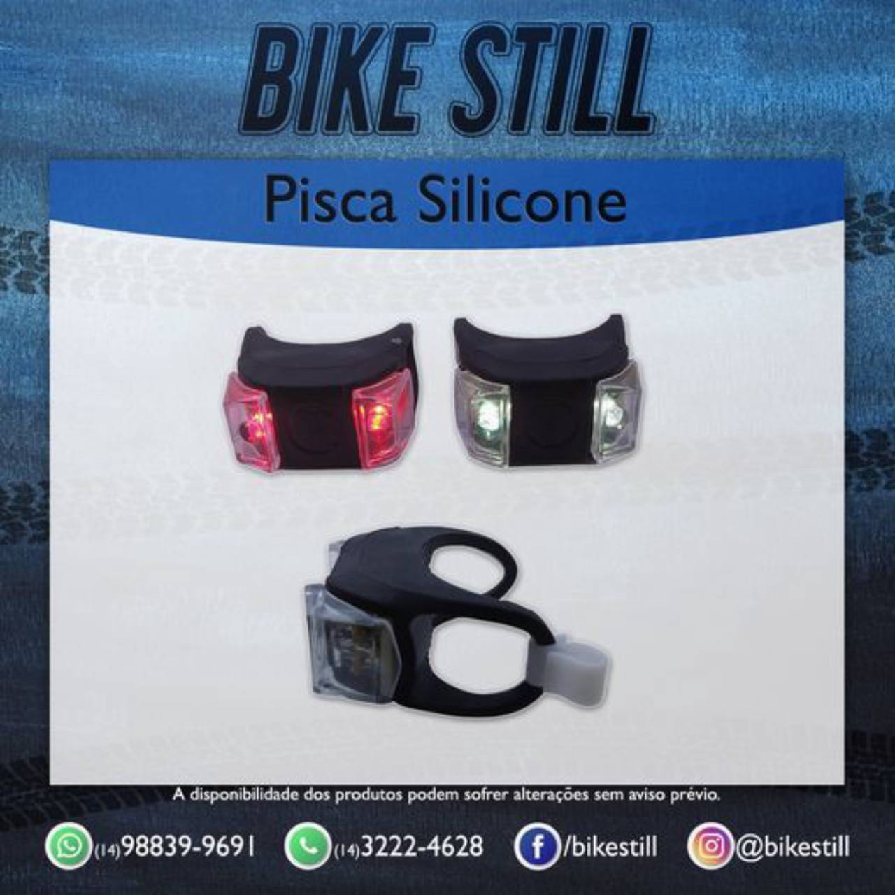 Pisca-alerta de led e silicone, utiliza pilhas. O conjunto possui dois piscas, um dianteiro com led branco e um traseiro com led vermelho, eles podem ser fixados facilmente no guidão e canote da bicicleta.