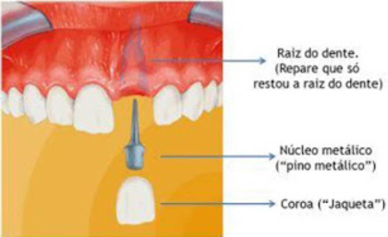 Este tipo de prótese é utilizado quando a raiz do dente ainda pode ser preservada. Após o tratamento de canal, um pino é inserido no interior da raiz para sustentar o substituto do dente. Essa pequena estrutura de sustentação é fabricada em liga metálica fundida. A parte superior do dente natural, que foi danificada, é removida e substituída por uma coroa artificial.
