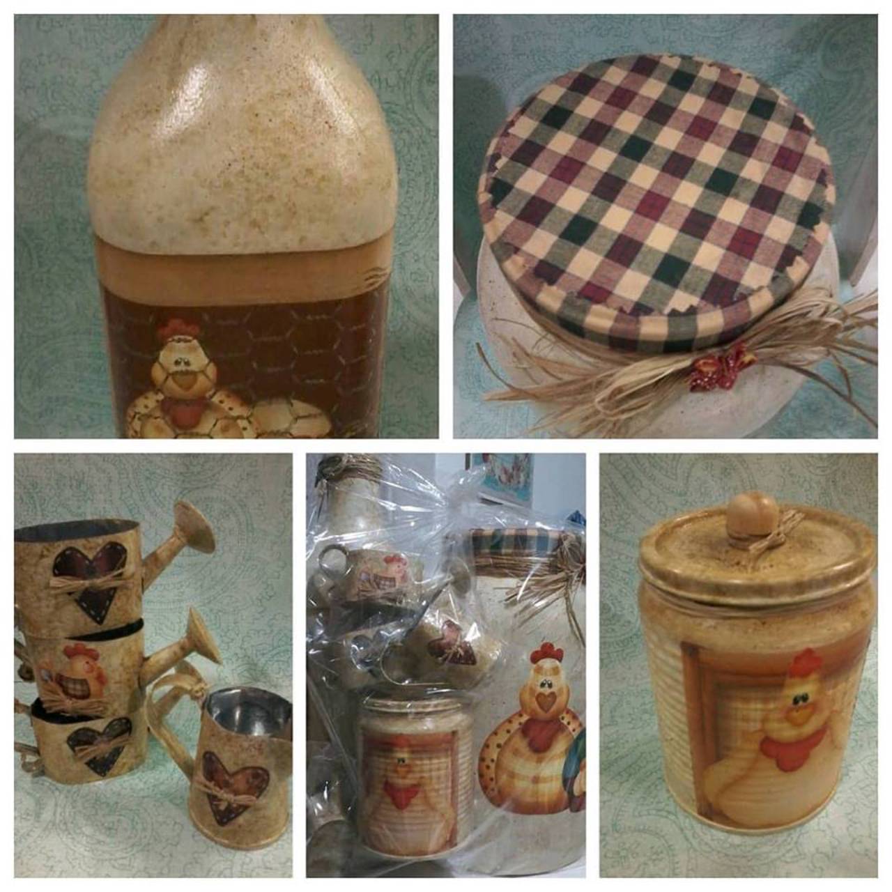 Lata de molho de tomate, garrafa de suco, miniaturas de regador e bule e pote de vidro de palmito formam um gracioso kit para enfeitar sua cozinha. Uma bela forma de presentear consciente.