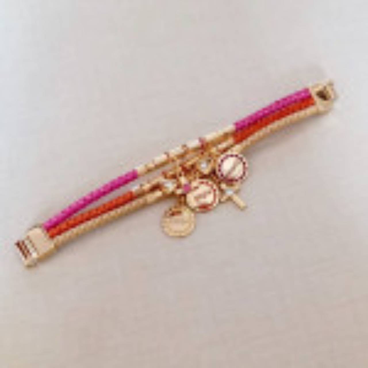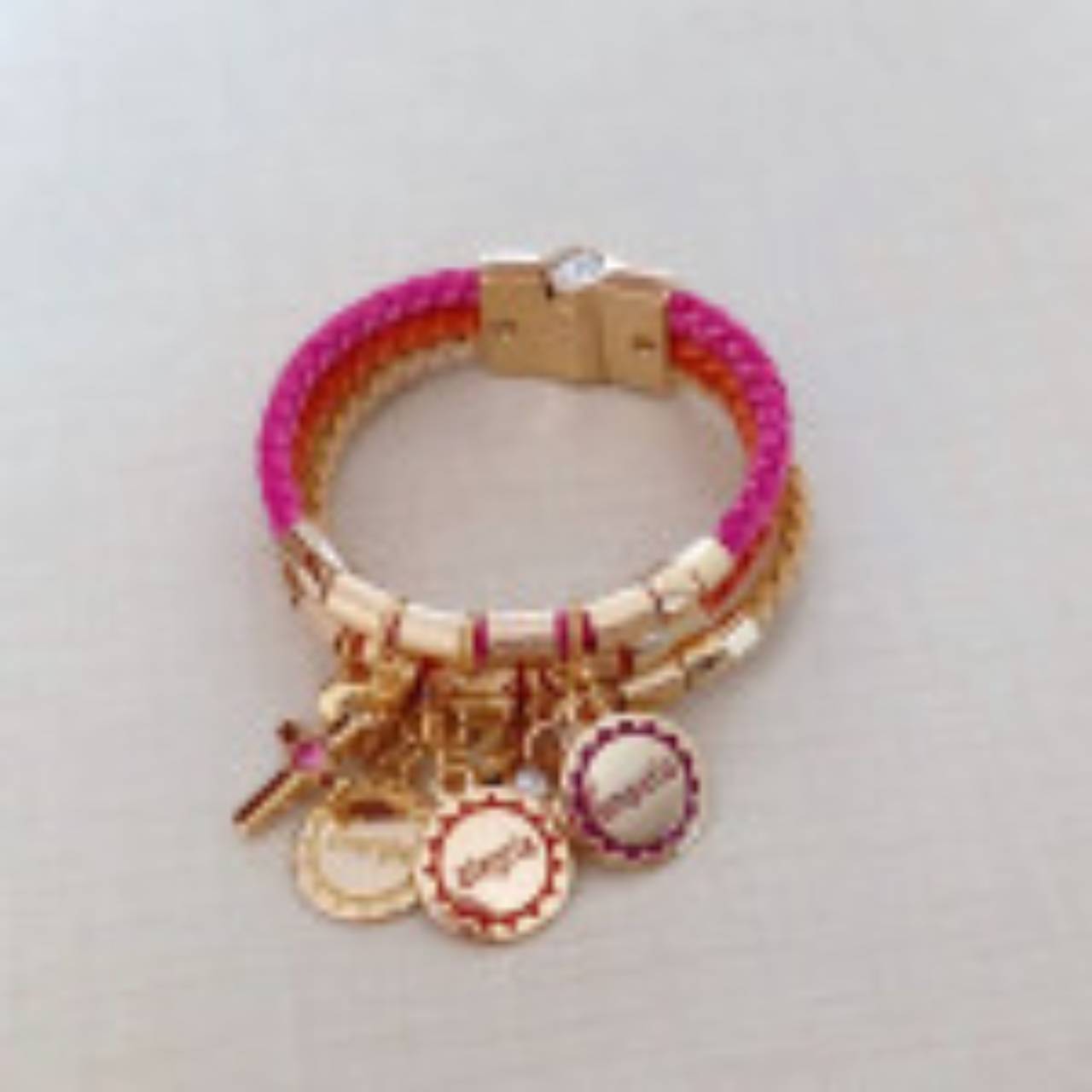 PulseirasEsta pulseira é formada por 3 tiras de couro trançadas nas cores amarela, laranja e pink com passadores caninhos banhados em ouro 18K. Os pingentes são: cruz com strass, coração com strass, coração vazado e o conjunto "para um novo amanhã", com as palavras "energia", "alegria" e "empatia". O fecho é imã e de fácil manuseio.