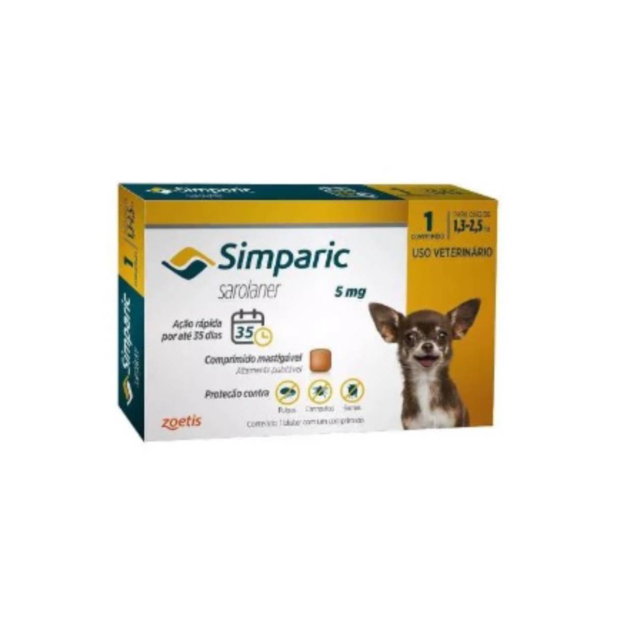 Farmácias VeterináriasAnti Pulgas Zoetis Simparic 5 Mg Para Cães 1,3 a 2,5 Kg utilizado para o tratamento das infestações por pulgas e sarna sarcótica. Após a administração do Simparic, a sua atividade contra pulgas dura, pelo menos, 5 semanas. O medicamento também pode ser utilizado como parte de uma estratégia de tratamento para o controle da dermatite alérgica por picada de pulga (uma reação alérgica às picadas de pulga). Contém a substância ativa sarolaner.