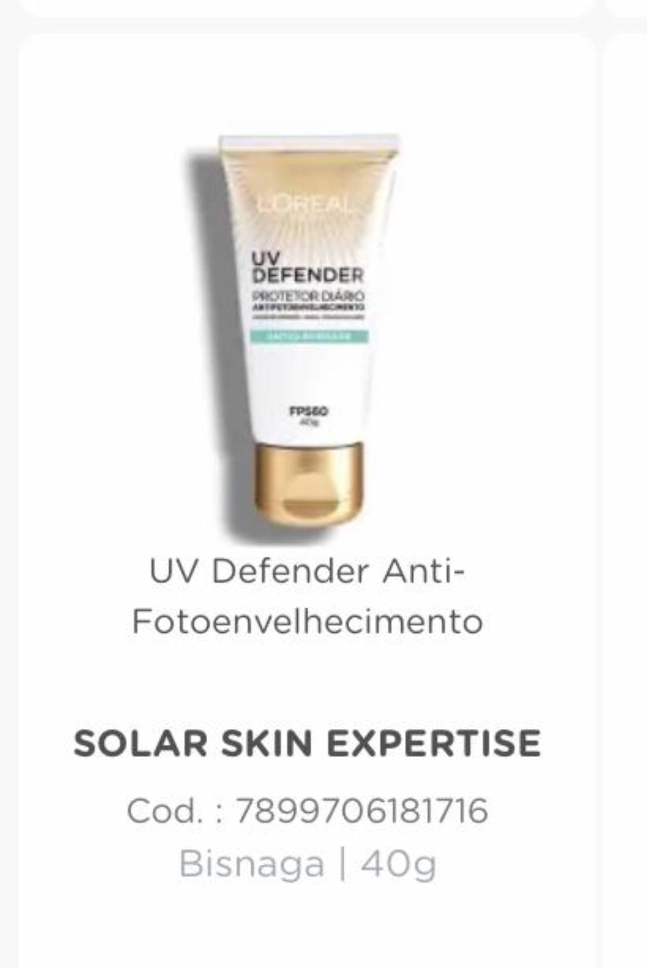 UV Defender Anti-Fotoenvelhecimento. Loreal
