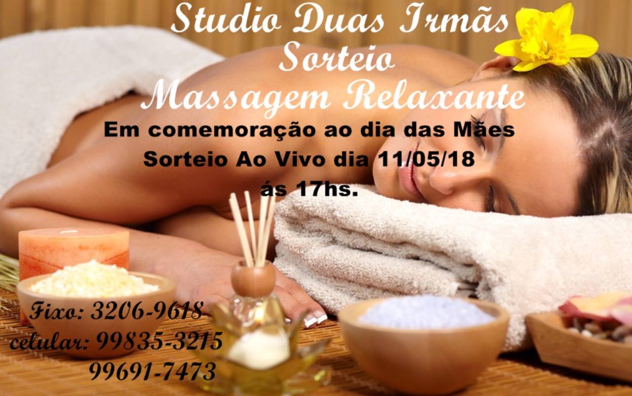 # Sorteio # Dia das Mães Dia:11/05/18 às 17:00Hs Ao Vivo. Massagem Relaxante Curtir a Página Studio Duas Irmãs e a Página da Solutudo. Comente "Eu Quero" Compartilhe a Imagem Marque o nome da sua Mãe. "Observação: Você e sua Mãe ganham a massagem Juntas."