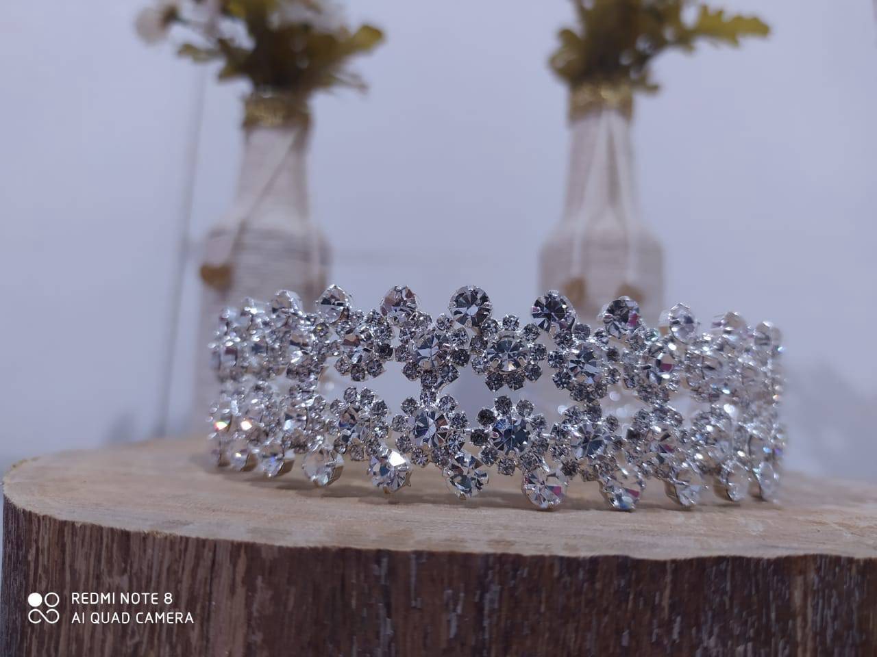 Linda tiara prateada com flores e pedrarias.