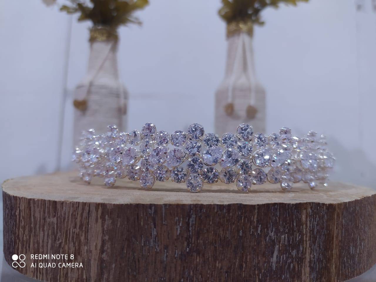 Linda tiara prateada com flores e algumas pedras.