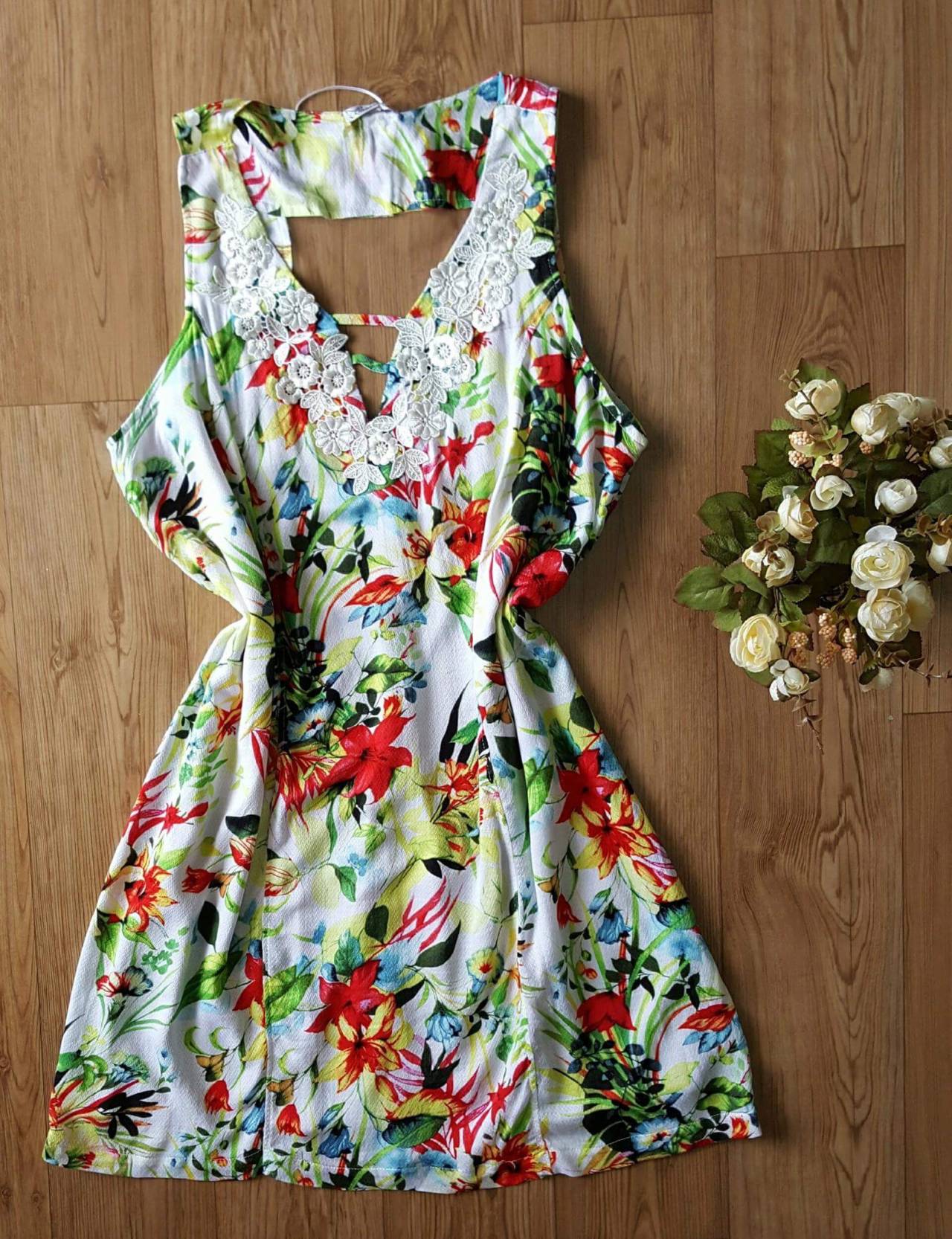 Vestido estampado com grippir no decote e tule nas costas, forrado.