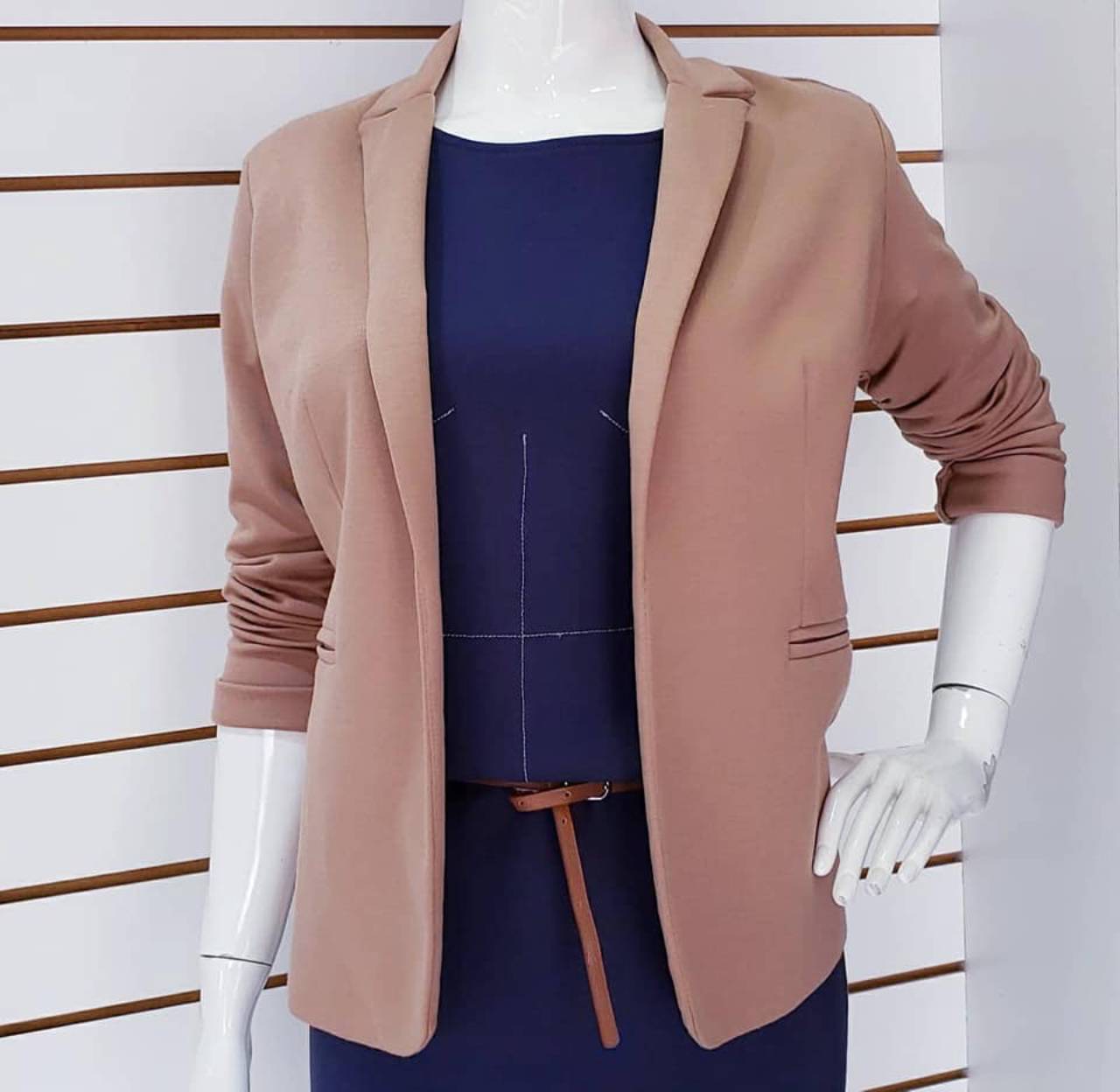Look 3: Blazer Nude de Malha + Vestido de Neoprene.