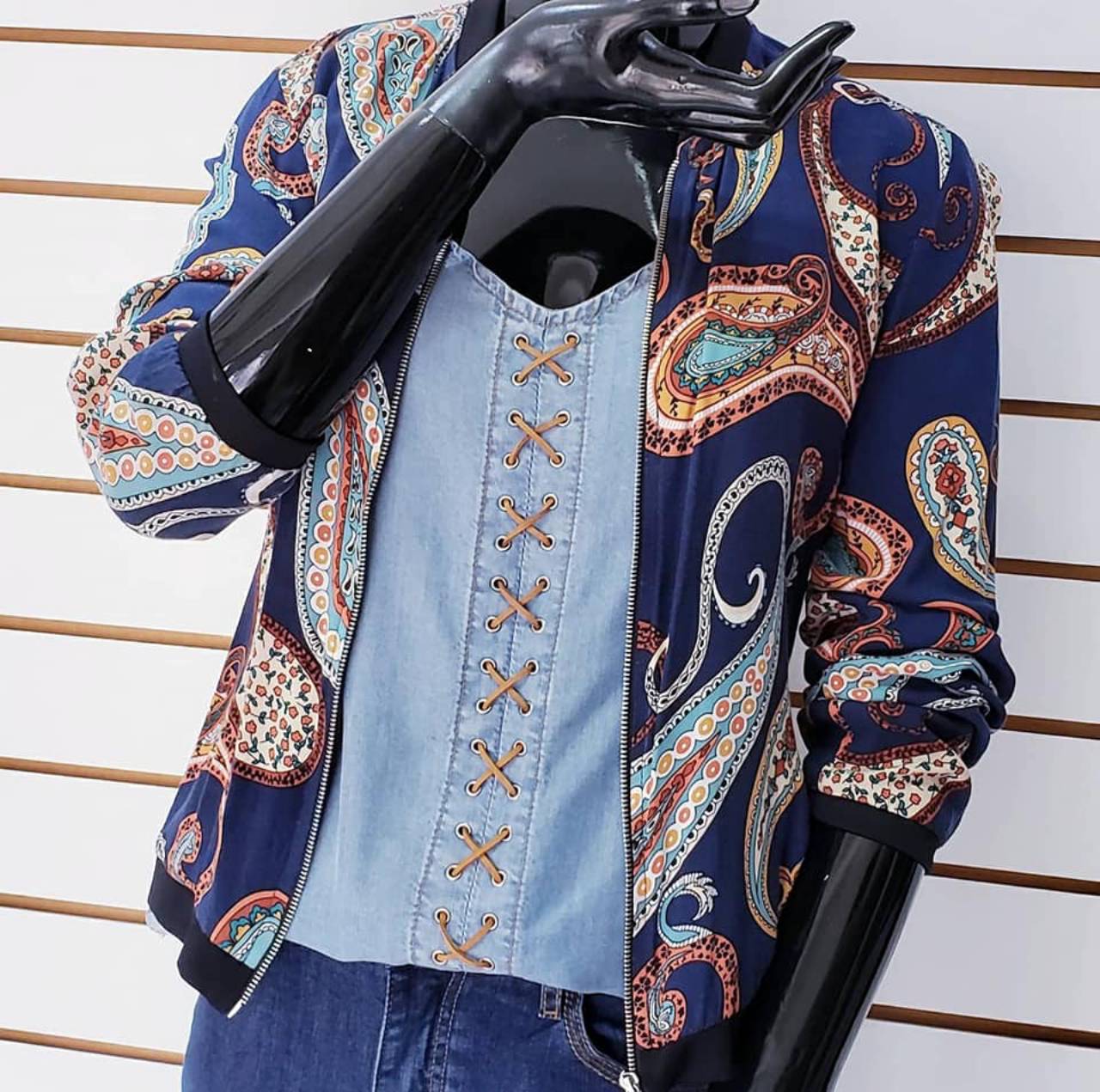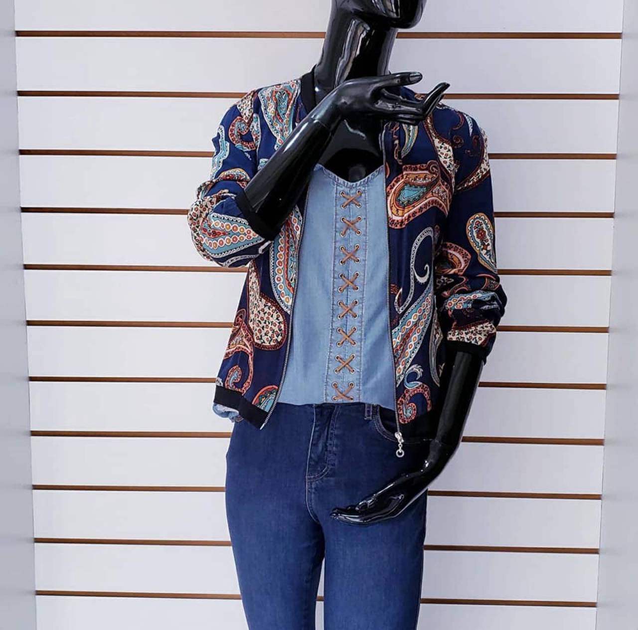 Look 4: Jaqueta Bomber de Viações + Regata Jeans c/ Ilhós + Calça Jeans Flare.