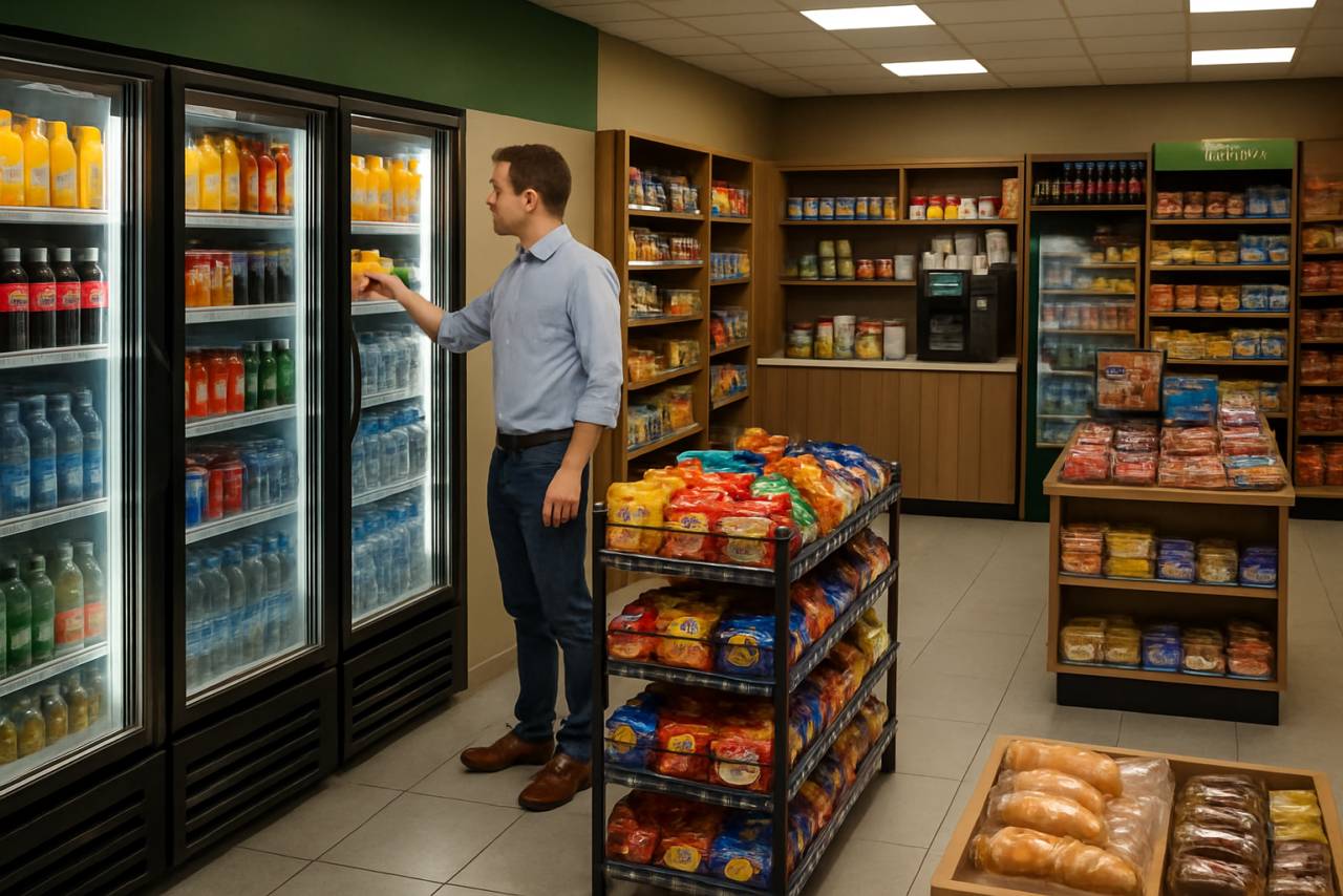 Bebidas geladas, cafés, snacks e lanches prontos
