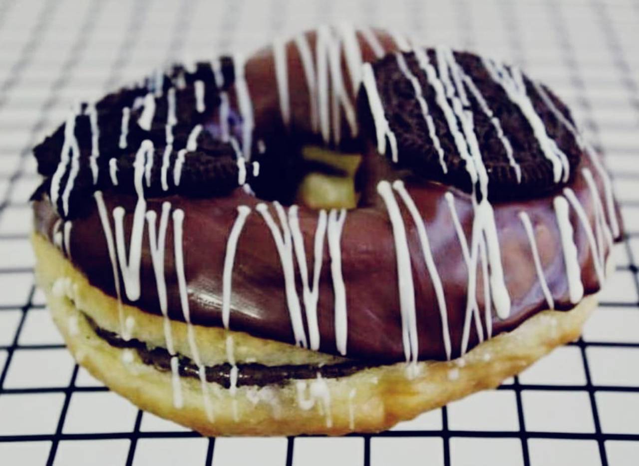DONUT RECHEADO DE BRIGADEIRO DE ÓREO COM COBERTURA DE CHOCOLATE MEIO AMARGO E UM ÓREO.