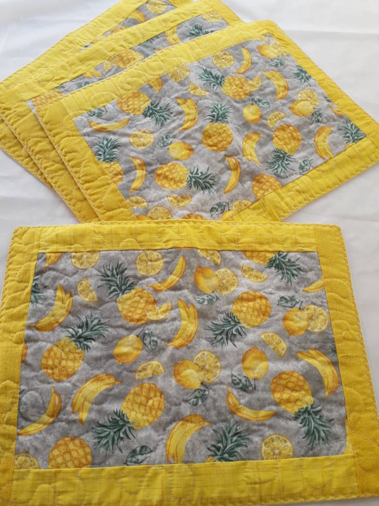 kit contém 4 peças de Jogos americanos estruturados com manta e forro. Cada peça mede aprox. 0,43cm x 0,32 cm.