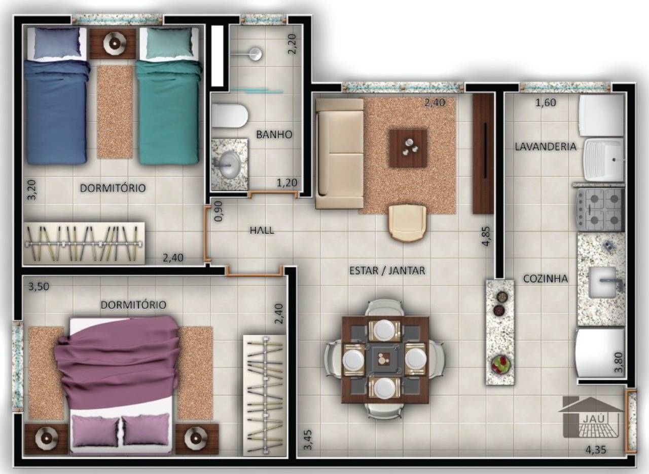 Apartamento com 02 dormitórios, sala, cozinha, banheiro e lavanderia.