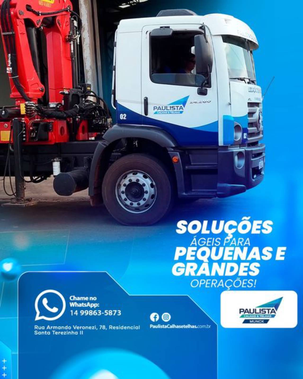 A Locação de Munck da Paulista Calhas e Telhas oferece uma solução eficiente e versátil para suas necessidades de movimentação de carga em Lençóis Paulista e região. Contamos com uma frota de equipamentos modernos e uma equipe especializada, garantindo agilidade e segurança em todas as etapas de sua obra.