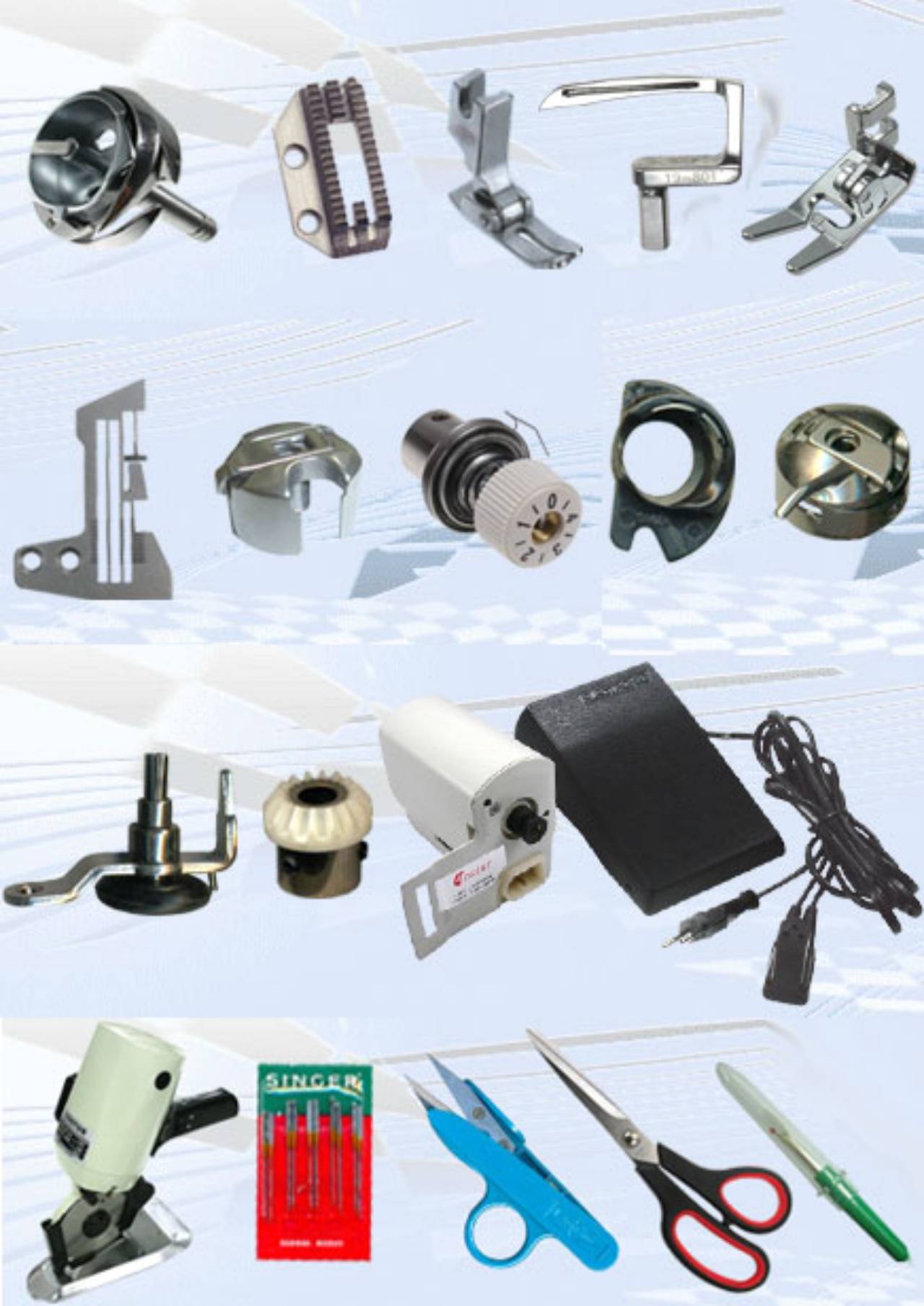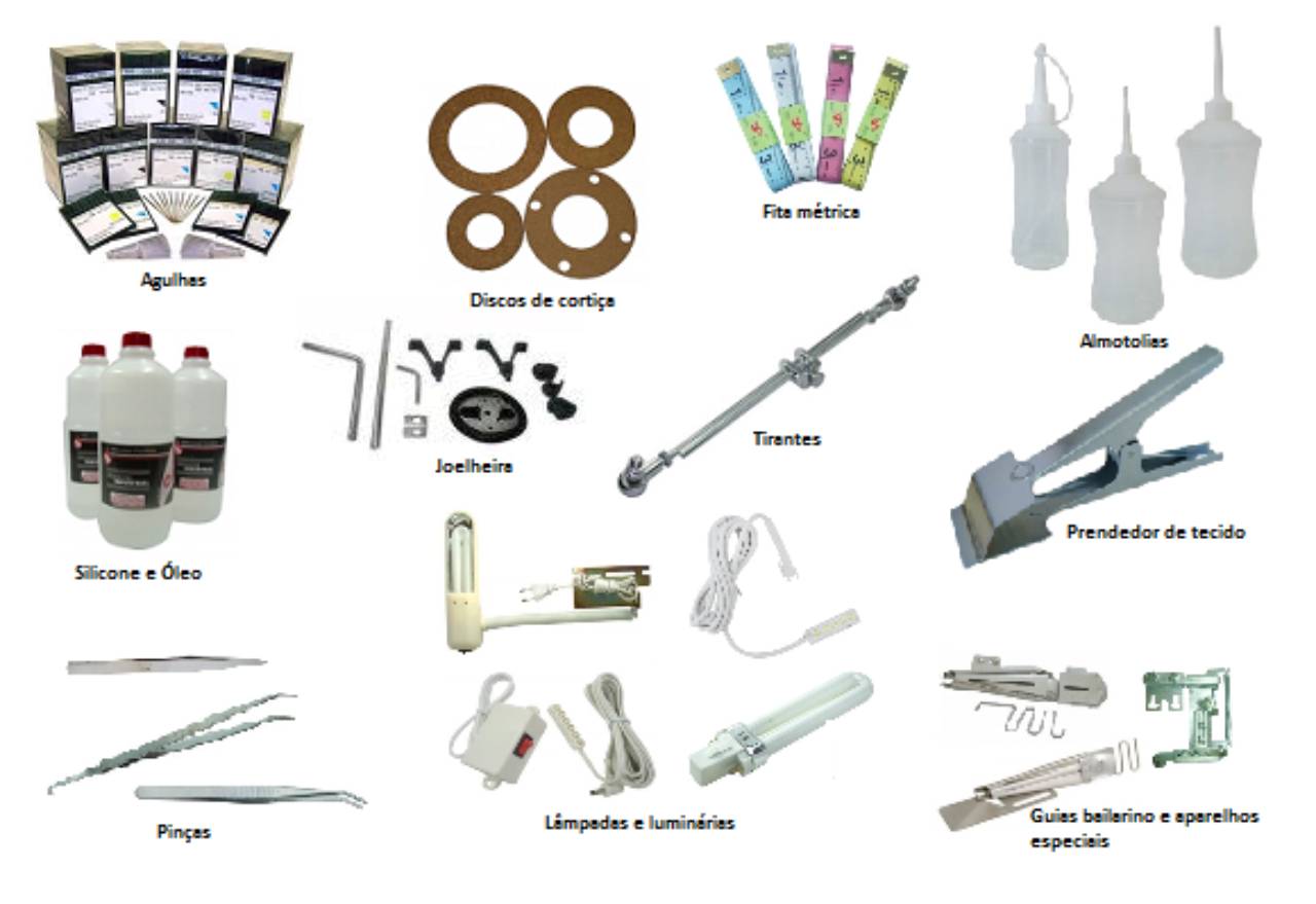 Peças, motorzinhos domésticos, agulhas, alfinetes, acessórios para máquinas de costura domésticas e industriais. Acessórios para costura, pés calcadores, aviamentos, tesouras, moldes, tesouras, lançadeiras, caixas de bobinas, bobinas, chaves de ligação, correias, óleo, pinças, cortiças e ventuinhas para motor, gabinetes, mesas, máquinas... etc