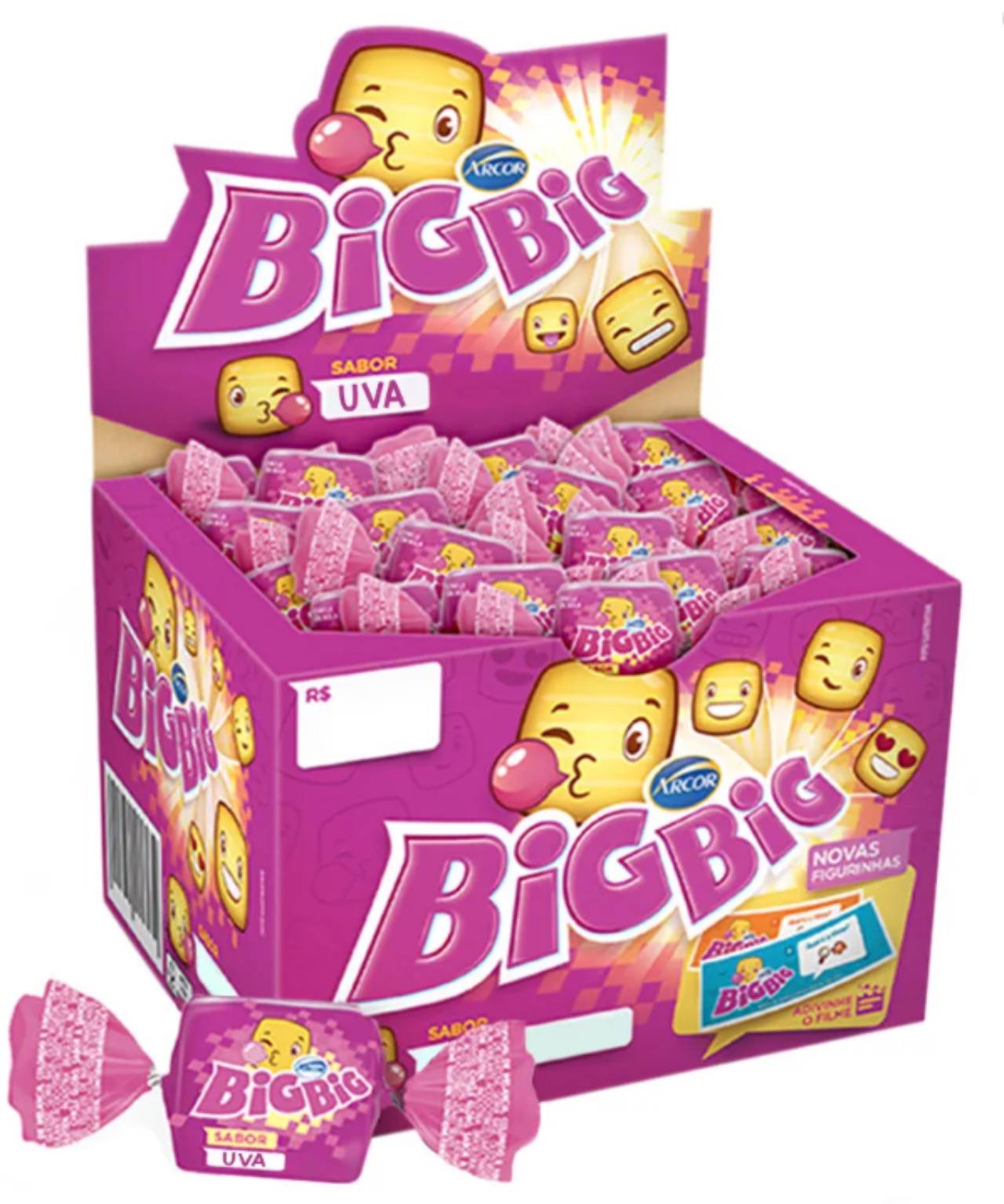 O chicle Big Big tem sabor de uva e vem com figurinhas colecionáveis.