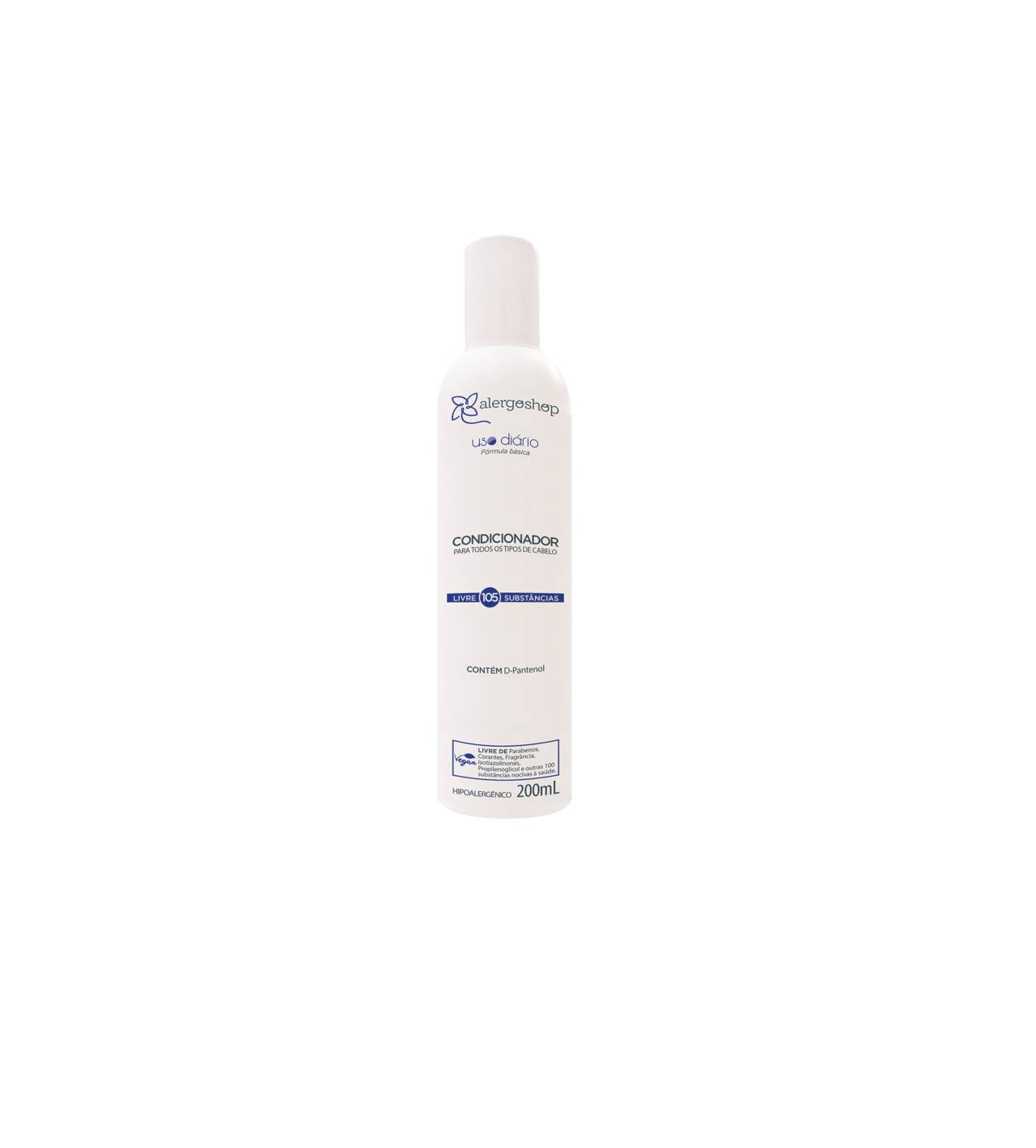 CONDICIONADOR USO DIÁRIO HIPOALERGÊNICO. 200ML. VEGANO, CRUELTY FREE. Para todos os tipos e cabelo é indicado para usar no dia a dia e para pessoas alérgicas aos condicionadores comuns. Sua fórmula sem fragrância é indicada para pessoas com sinusite, rinite ou asma desencadeadas por perfumes. O condicionador tem como diferencial o hidratante D-Pantenol (Pró Vitamina B5) que proporciona brilho e suavidade aos cabelos.