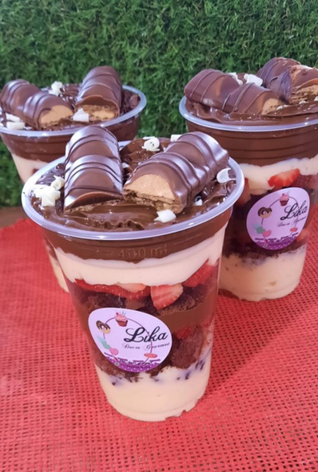 Brigadeiro de leite ninho, brownie, morango, nutella e kinder bueno para finalizar, 400 ml.