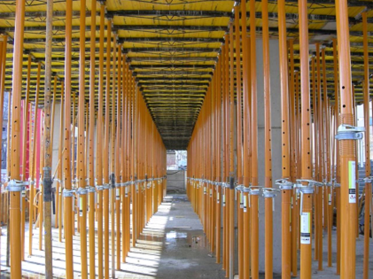 A escora metálica é um equipamento leve, resistente, econômico, de fácil montagem e desmontagem. Suporta cargas elevadas e tem grande versatilidade de uso em escoramento de vigas ou lajes planas.