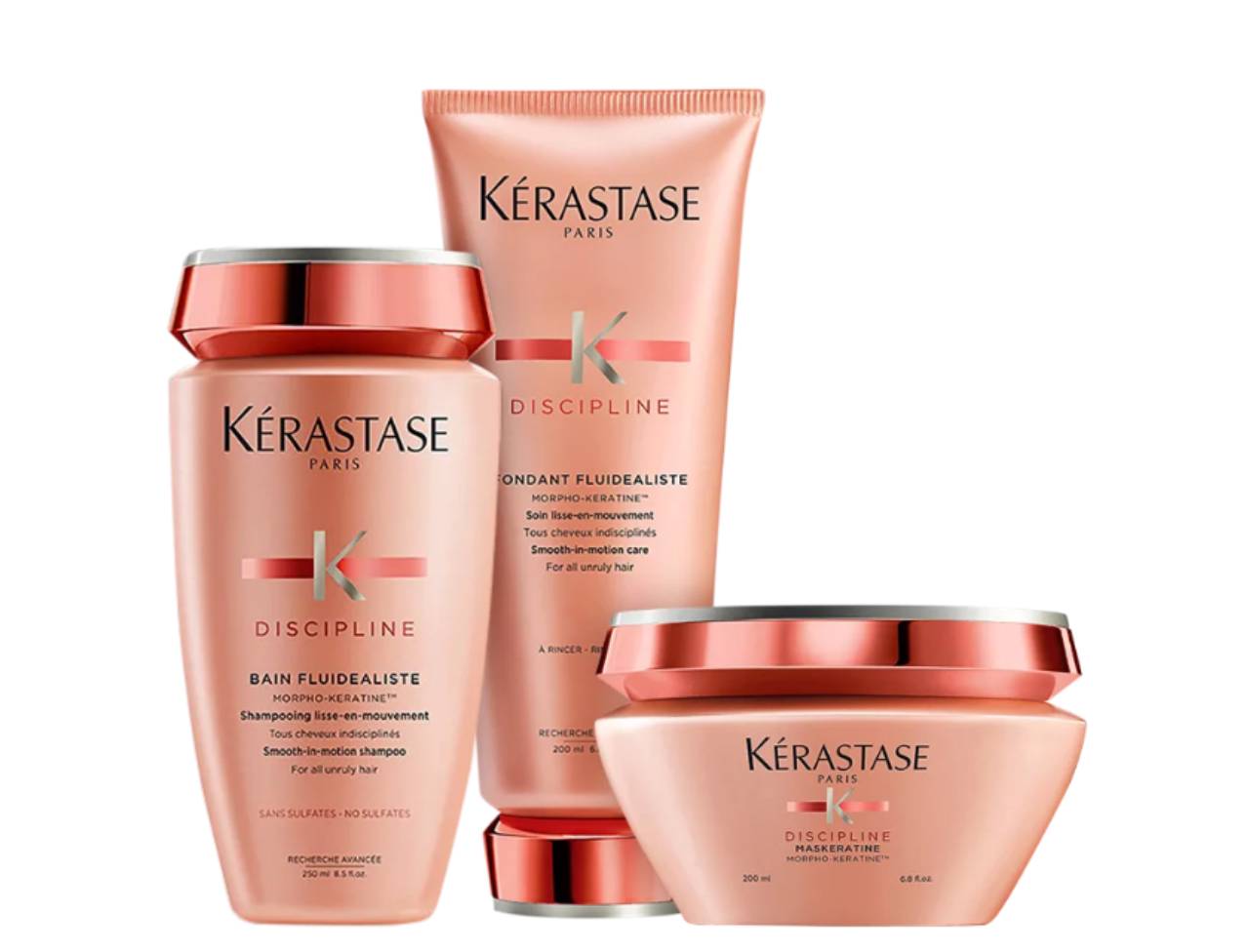 Ritual de disciplina para cabelos rebeldes ou com frizz, lisos a ondulados. Kit Kérastase Discipline Trio alinha e controla os fios.