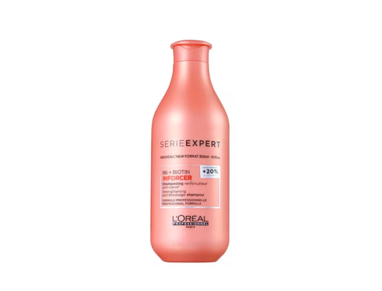 Shampoo para cabelos frágeis e quebradiços. L'Oréal Professionnel Inforcer Serie Expert funciona como um suplemento capilar de força e prevenção a quebra.