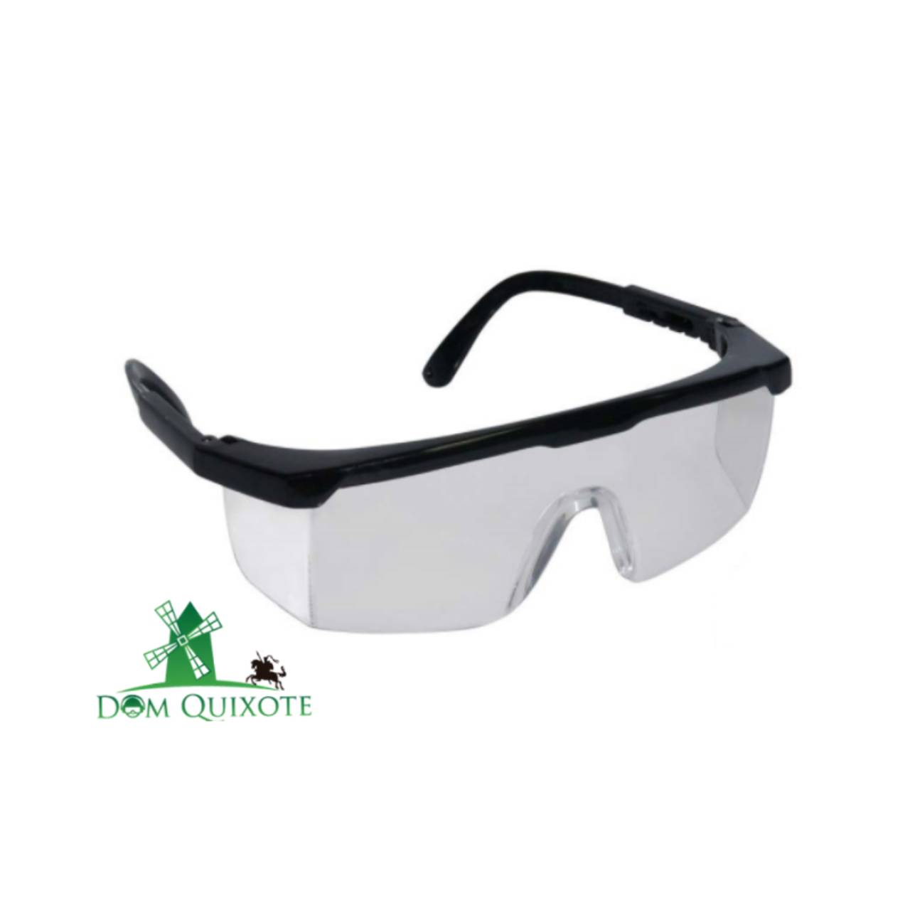 Óculos de proteção visual incolor com haste preta.