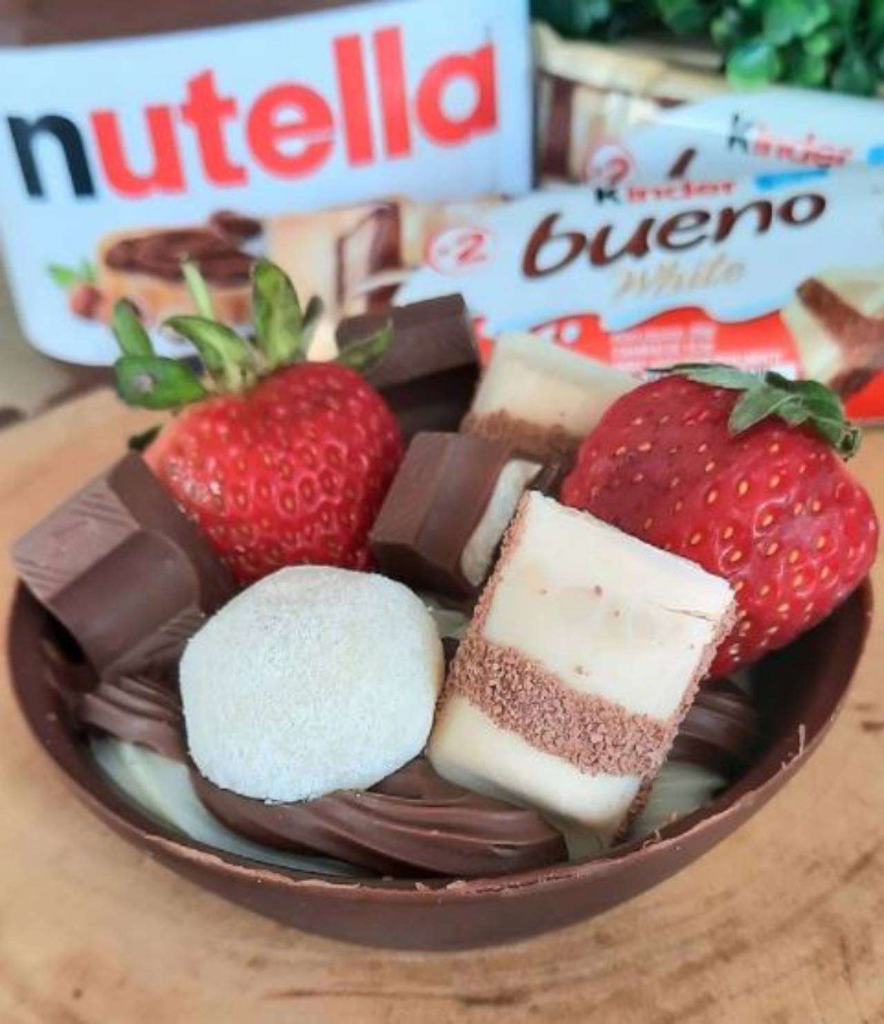 Base de chocolate ao leite, recheada com brigadeiro leite ninho, nutella, brownie, morangos e chocolates da marca.