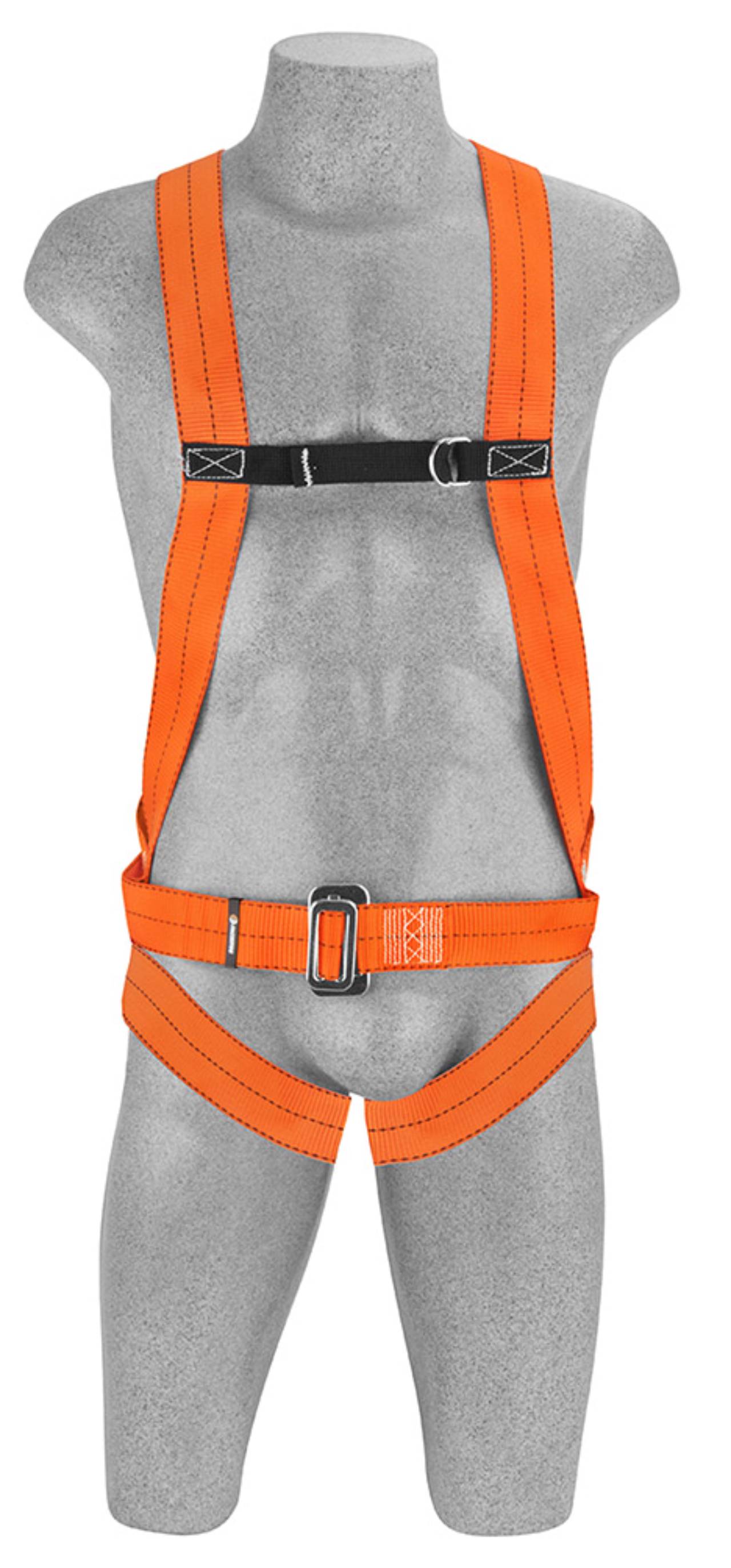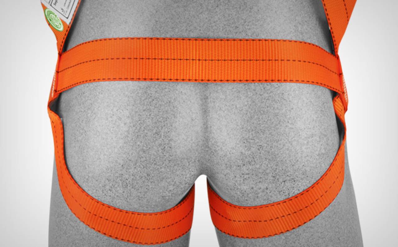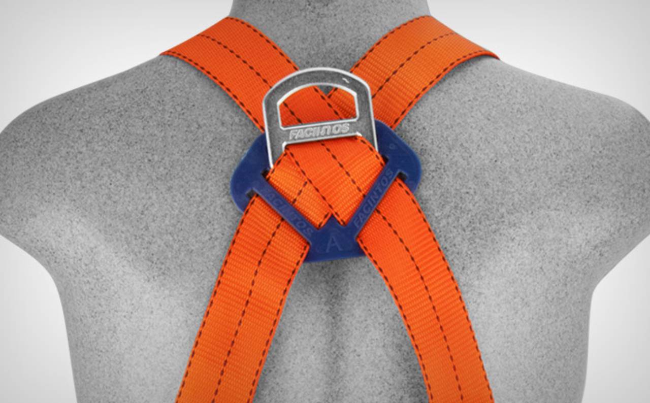 Cinto para-quedista em fita de poliéster, possui 1 argola dorsal em "D" para retenção de quedas.