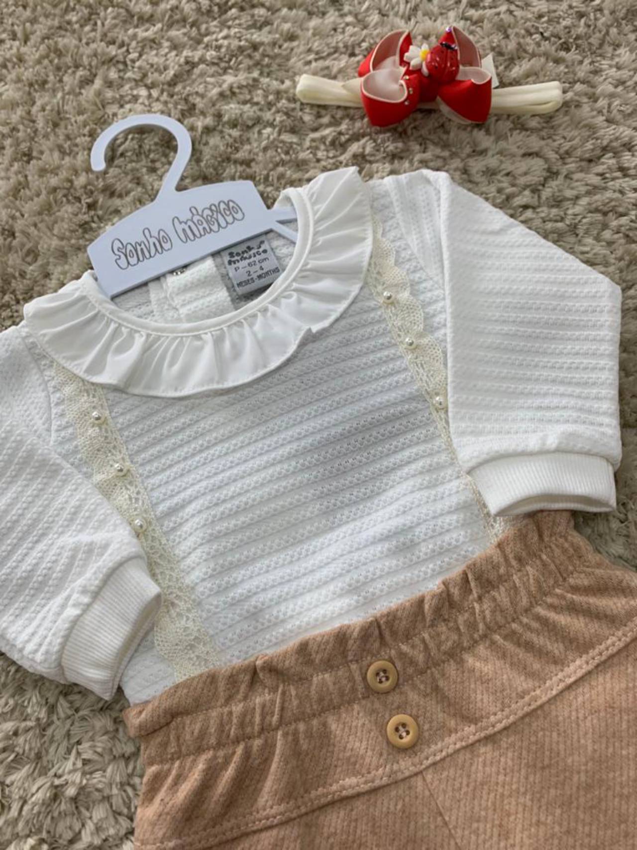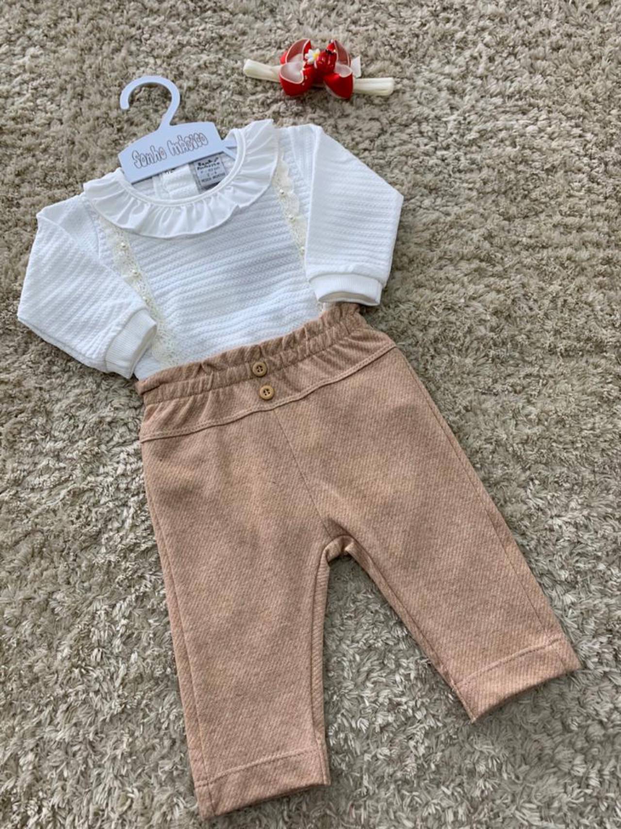 Conjunto body com detalhe em perólas com renda e calça com detalhe no cós. Confortável e muito estiloso para as princesas.