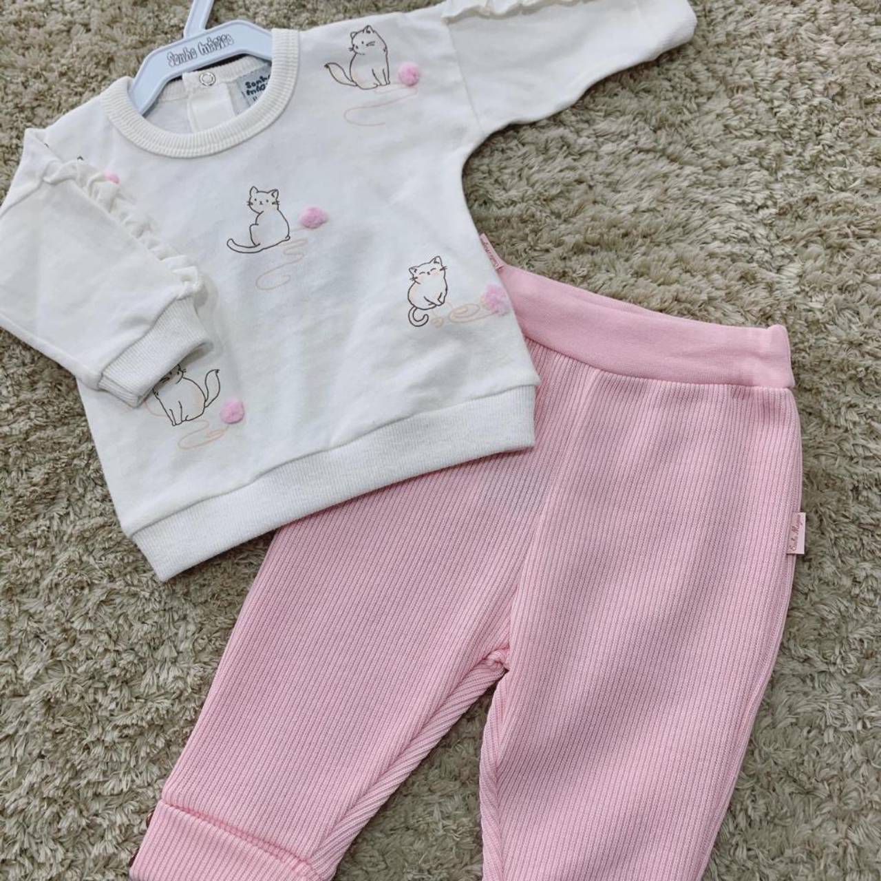 Conjunto blusa e calça. Detalhe de botões nas costas e calça canelada. Confortável e delicado.