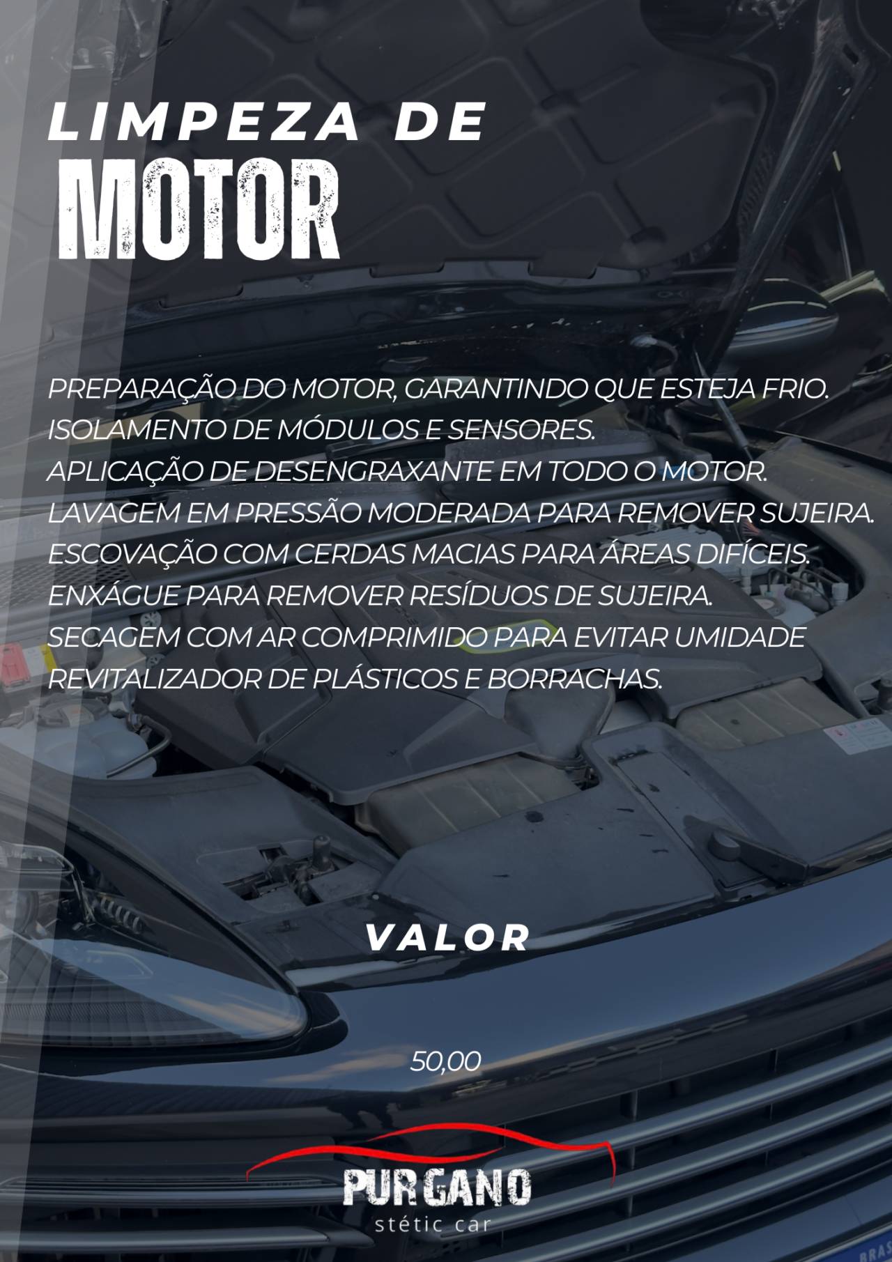 Lava - Rápido - Estética AutomotivaA limpeza de motor realizada pela Purgano Stetic Car, em Lençóis Paulista (SP), oferece cuidado, segurança e eficiência para o funcionamento do seu veículo. O serviço é ideal para quem deseja manter o motor limpo, livre de resíduos e em perfeito estado, contribuindo para o melhor desempenho e durabilidade das peças.