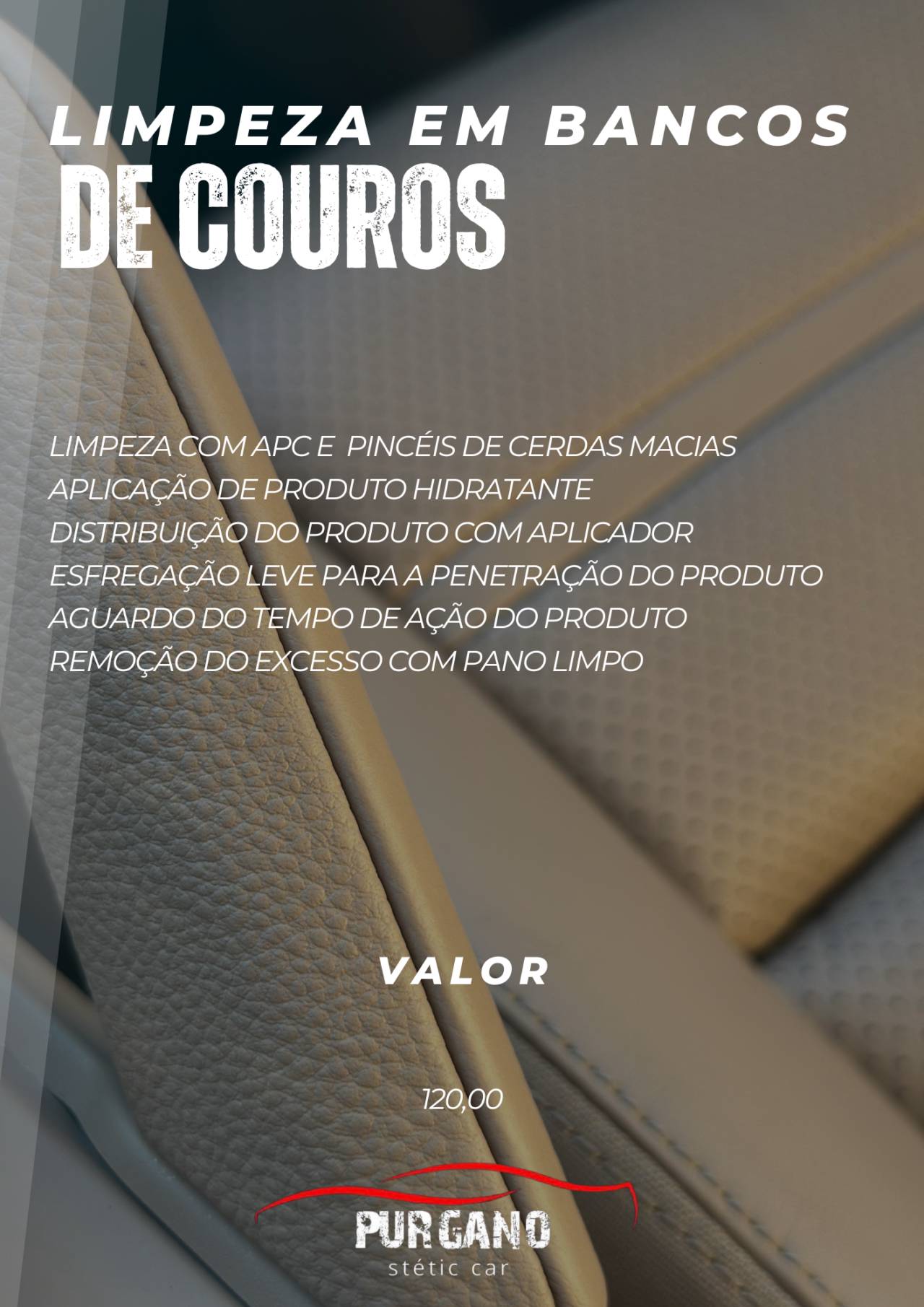 A limpeza e hidratação de bancos de couro é feita com produtos específicos que nutrem as fibras naturais, mantendo o aspecto novo e o aroma característico do couro. A equipe da Purgano Stetic Car realiza o serviço de forma minuciosa, garantindo acabamento profissional, segurança e durabilidade para o interior do seu veículo.