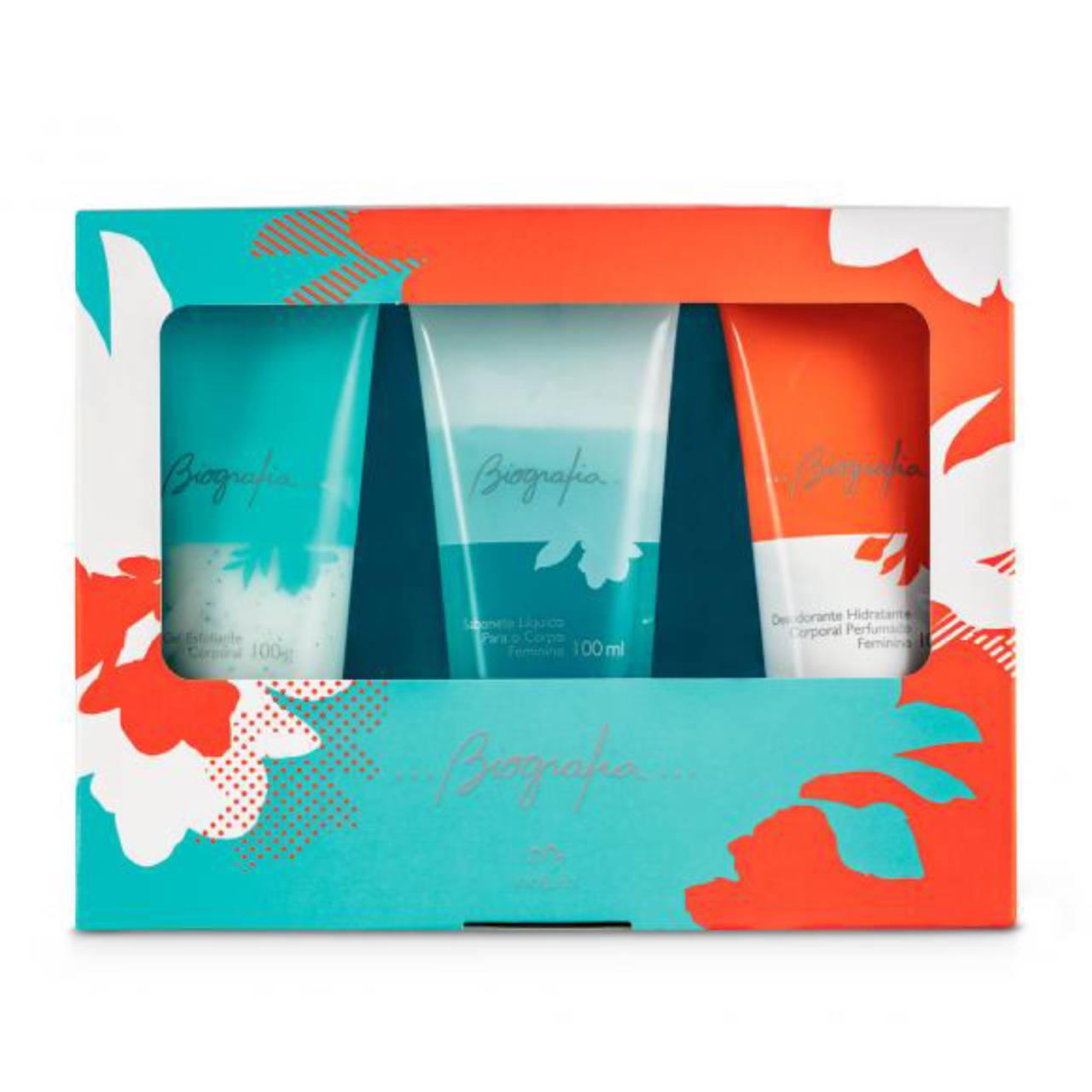 Kit Biografia corporal completo para presentear alguém ou a você mesma com fragância floral refrescante contem no kit: Gel esfoliante corporal,Sabonete líquido para o corpo e Desodorante hidratante corporal perfumado.