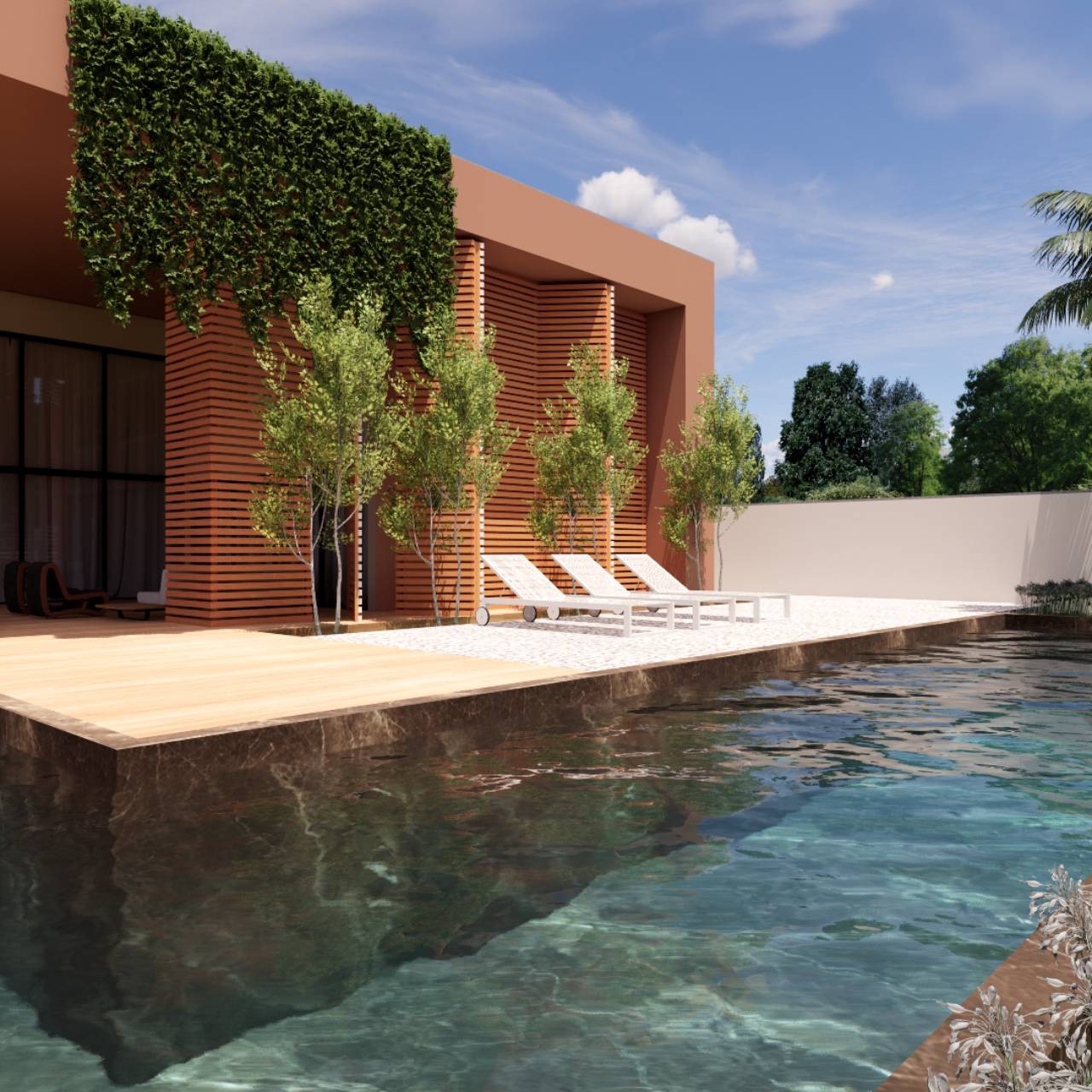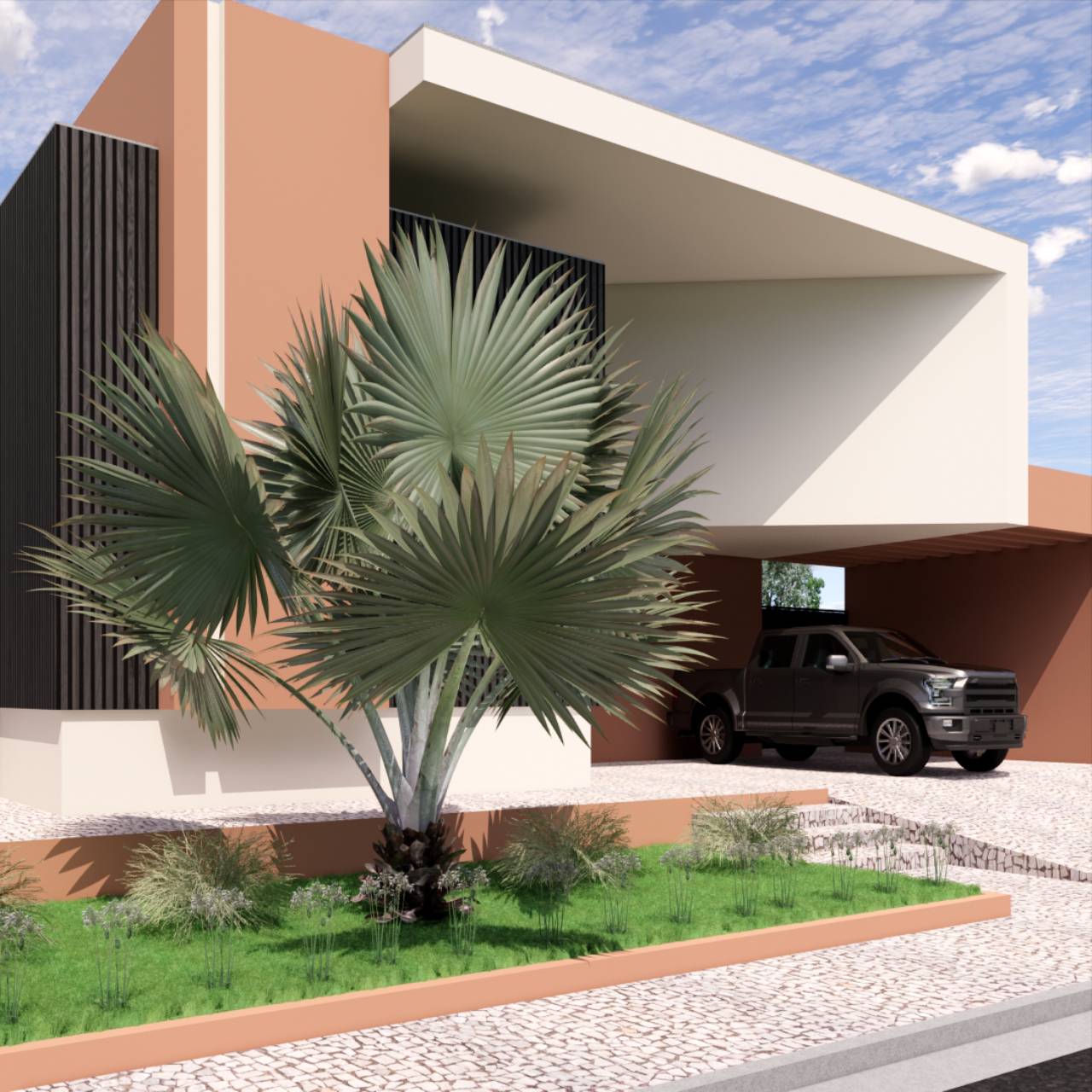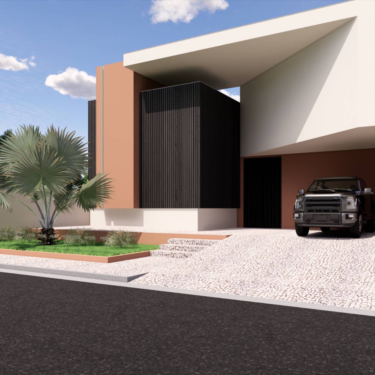 Este projeto residencial destaca-se pela sua arquitetura arrojada e contemporânea, rompendo com o convencional através de linhas hexagonais e formas exuberantes. A fachada minimalista, revestida em ripado de alumínio preto e tons de terracota suaves, exibe uma palmeira imponente que emoldura a entrada. O contrapiso em pedra natural clara, aliado a um sistema de iluminação rasante, realça a modernidade e o efeito translúcido da residência. Um jardim frontal cuidadosamente projetado complementa a fachada, conferindo um toque final de elegância e sofisticação.