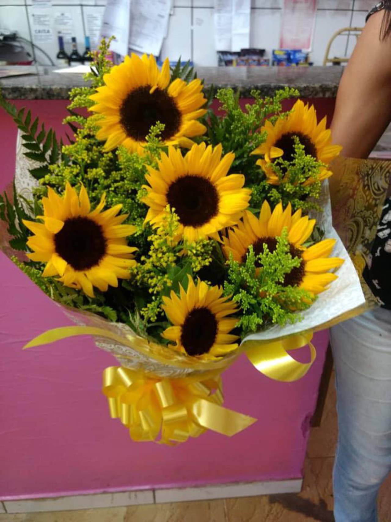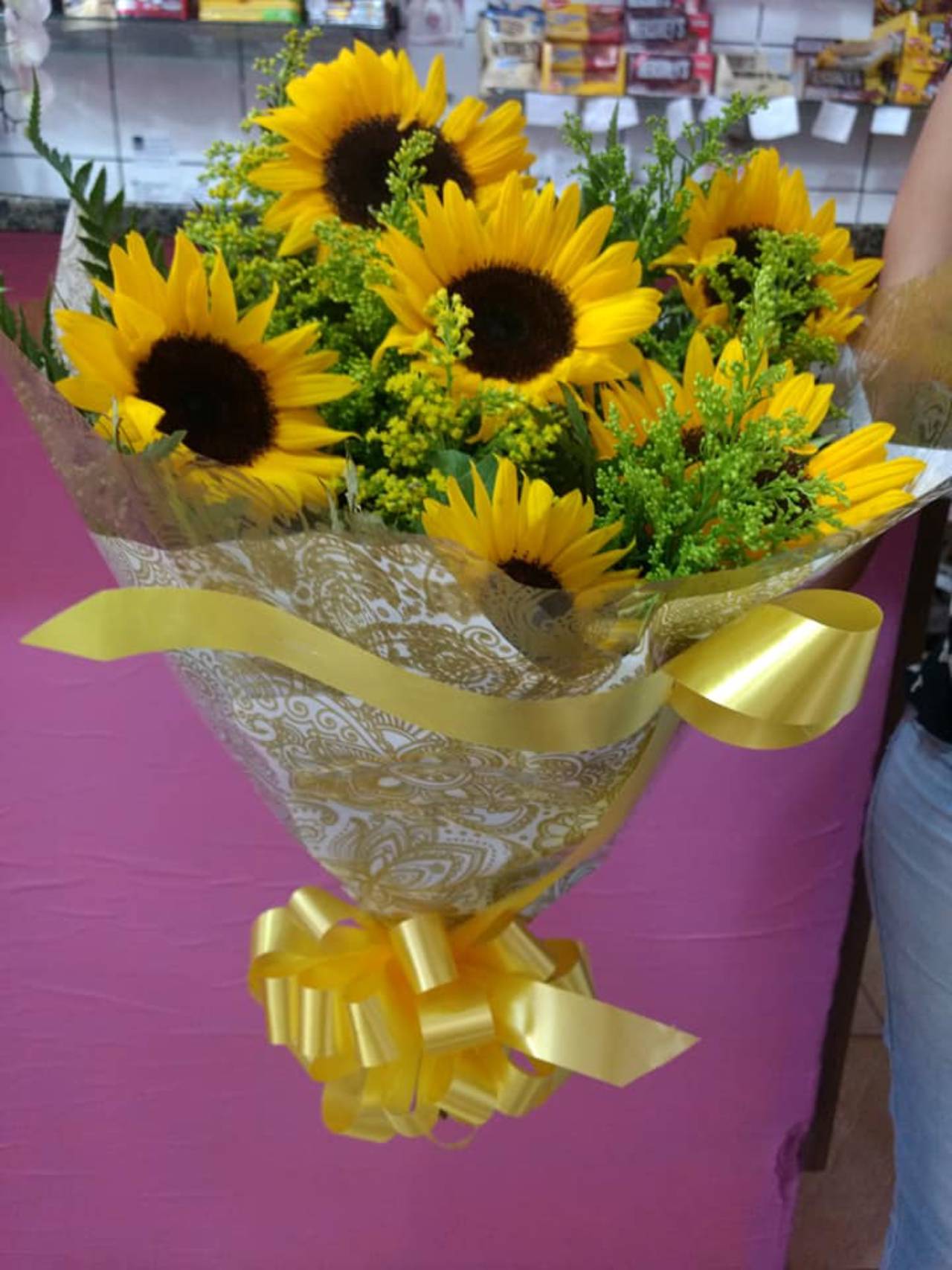 - Montagem: Os girassóis são organizados de forma harmoniosa por nossos floristas, que cuidam para criar um arranjo equilibrado e visualmente impactante. O buquê é montado para destacar a beleza natural das flores.