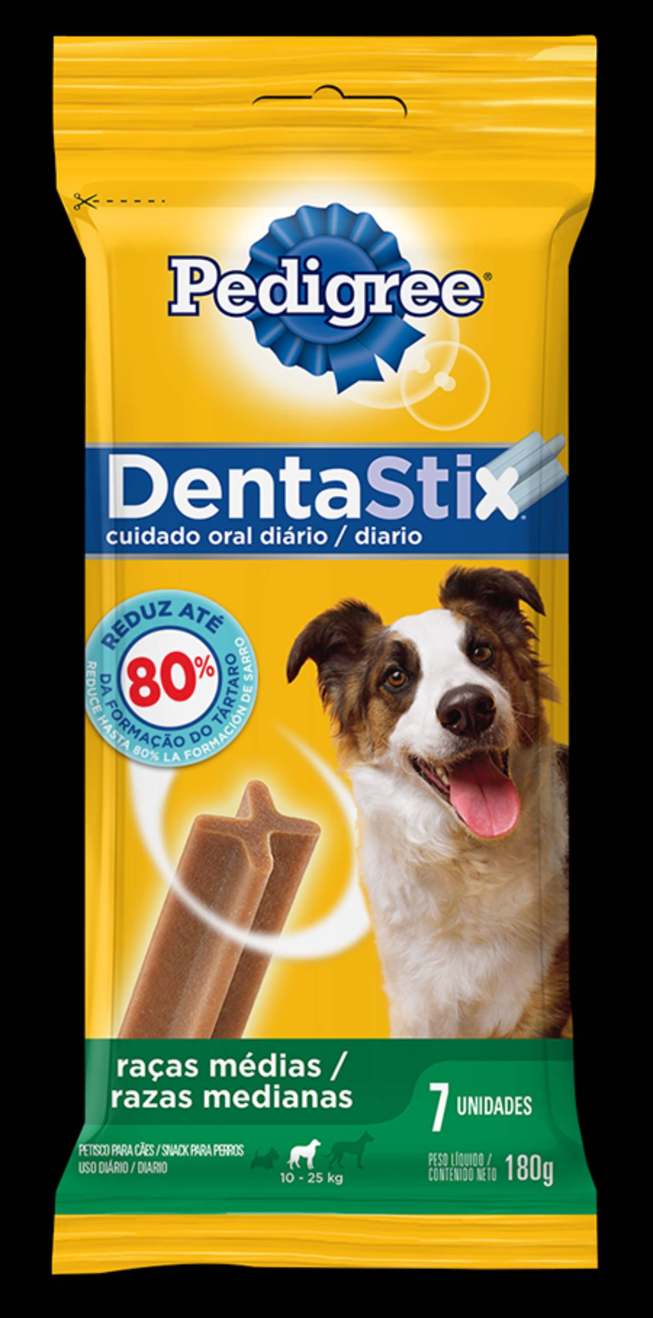 PEDIGREE DENTASTIX™ é uma efetiva solução diária para ajudar a manter dentes limpos. Reduz até 80% da formação do tártaro quando oferecido diariamente. Possui textura especial e ingredientes ativos Desenvolvido pelo Centro de Nutrição Animal WALTHAM™ Um sabor que eles adoram