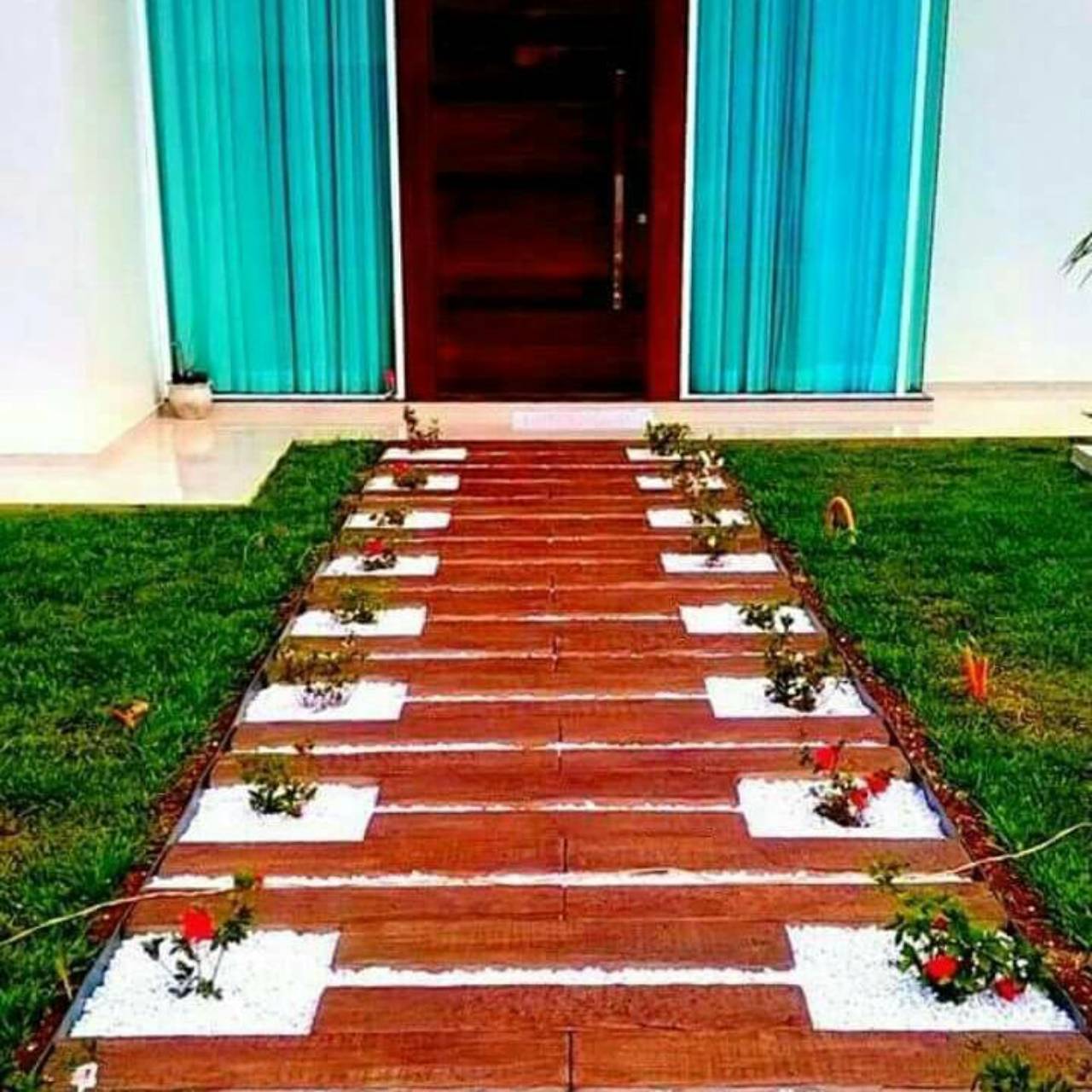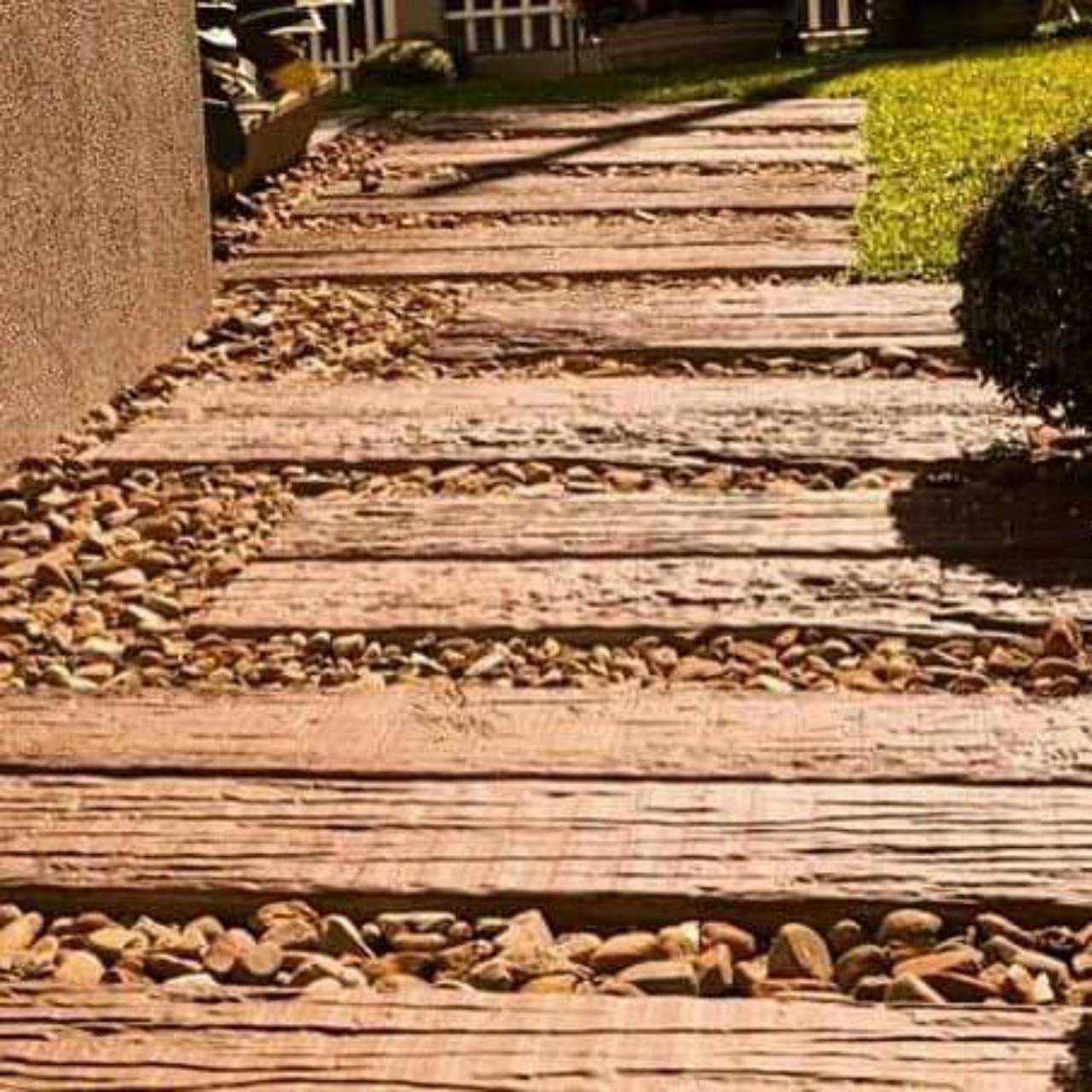 Pisantes de cimento que imitam dormentes, uma opção mais barata para compor seu jardim.