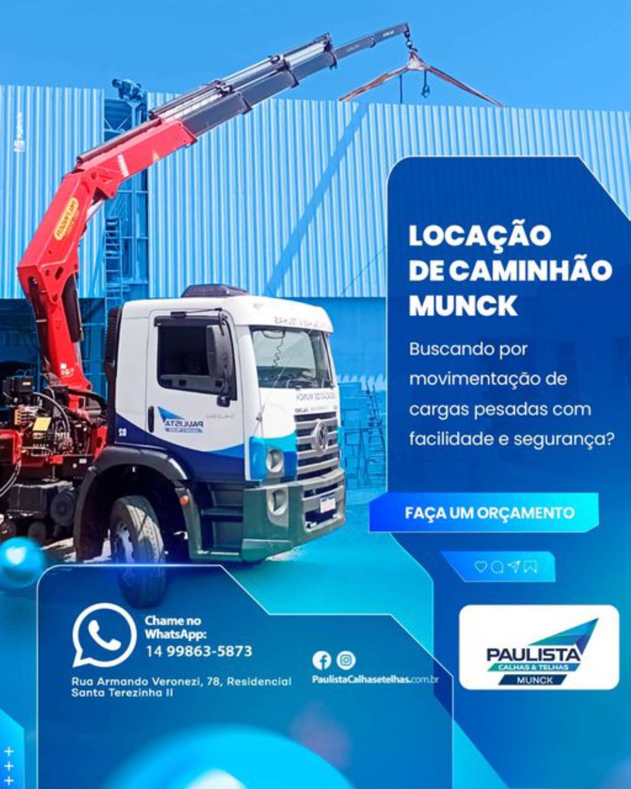 Optar pela Locação de Munck da Paulista Calhas e Telhas é escolher uma solução confiável e eficiente para suas necessidades de movimentação de carga em Lençóis Paulista. Conte com nossa experiência e comprometimento para tornar sua obra um sucesso. Entre em contato conosco hoje mesmo e descubra como podemos ajudar a impulsionar o progresso de sua construção.