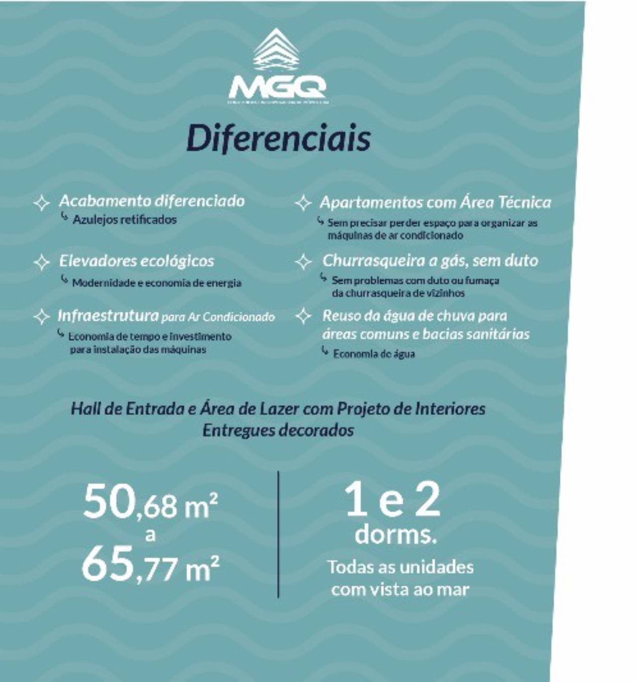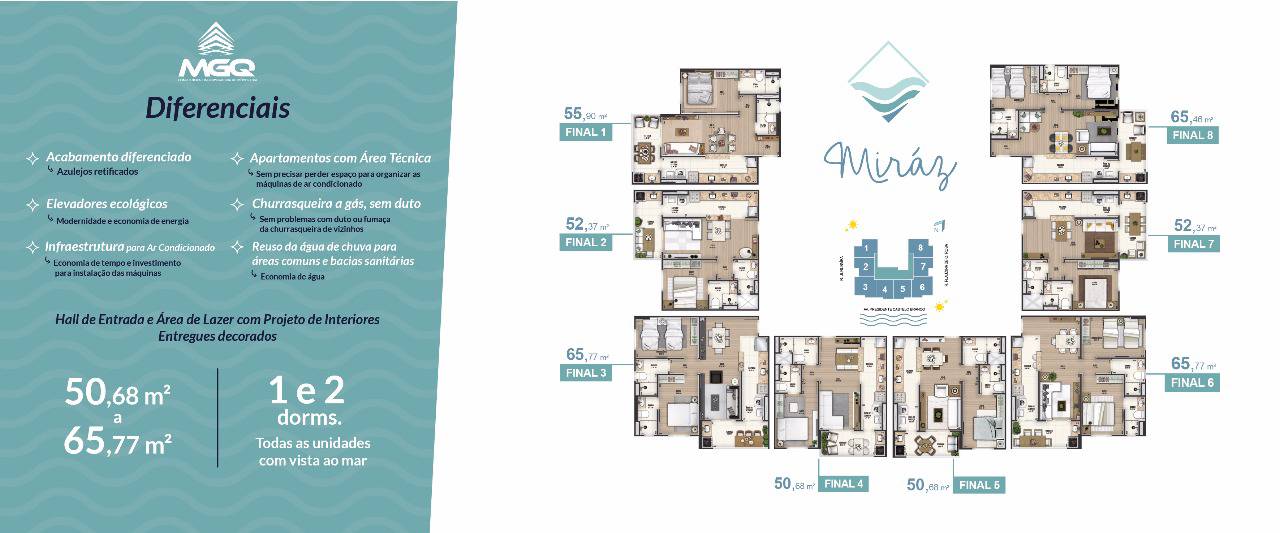 Todas as unidades com vista para o mar. De 50,68 m² a 65,77 m² Churrasqueira na sacada 1 ou 2 vagas de garagem Lazer completo Porcelanato retificado |