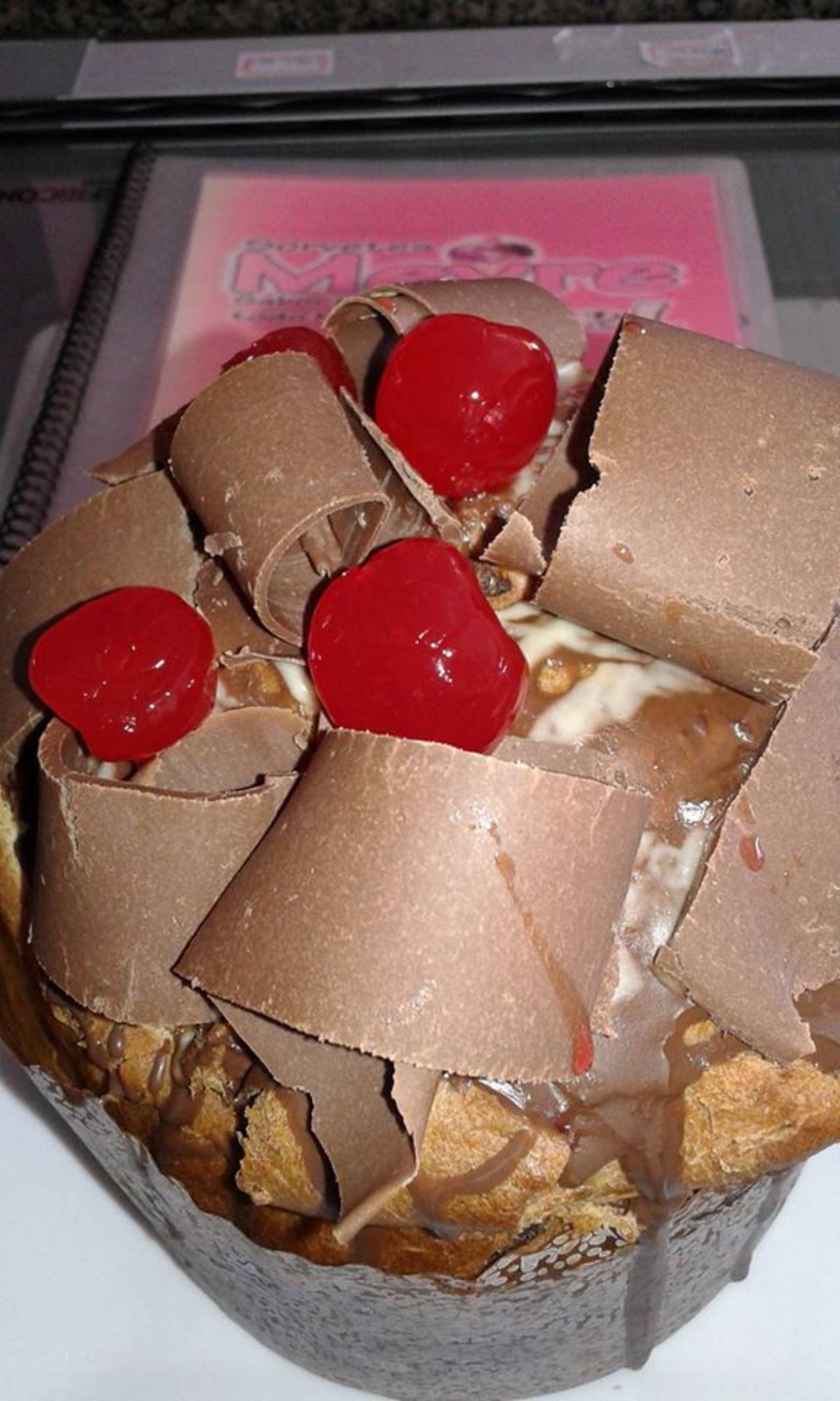 Panetone recheado com sorvete e brigadeiro mole E cereja