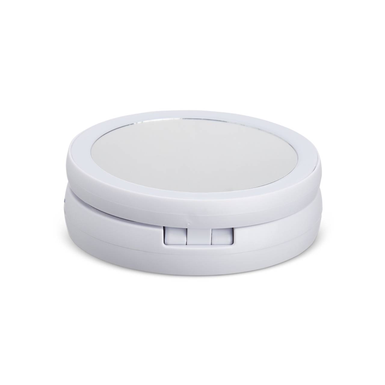 Descrição: Espelho Dobrável com LED Recarregável e dupla face, material plástico. O espelho possui uma das faces ampliada 10x e do outro lado, espelho convencional 1x, iluminação LED dos dois lados, três compartimentos na base para armazenamento de acessórios, espelho giratório e regulável, botão liga/desliga e botão para acionar a iluminação, com funcionamento à base de 4 pilhas AA (não acompanha) ou via cabo USB.