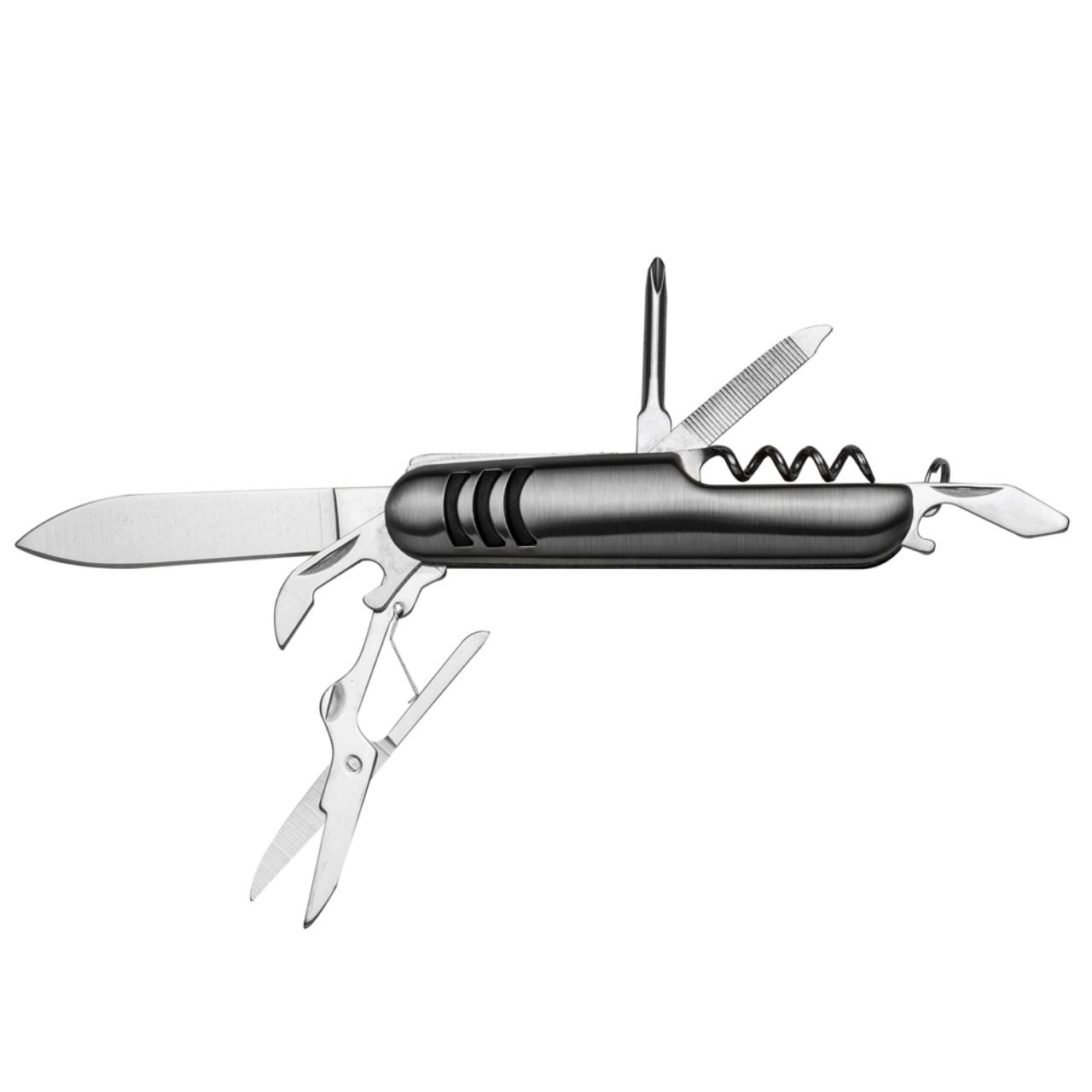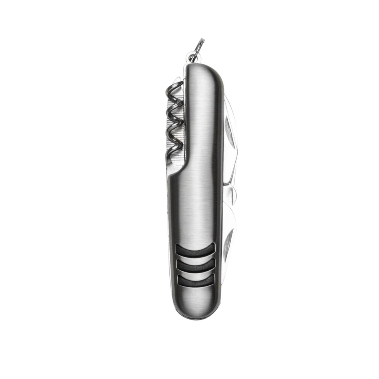 Descrição: Canivete metal 7 funções com detalhes emborrachados preto(três linhas frente e verso). Possui: lâmina de corte, mini tesoura, abridor de lata, abridor de garrafa, chave phillips, lixa e saca rolhas. Acompanha bainha de nylon.