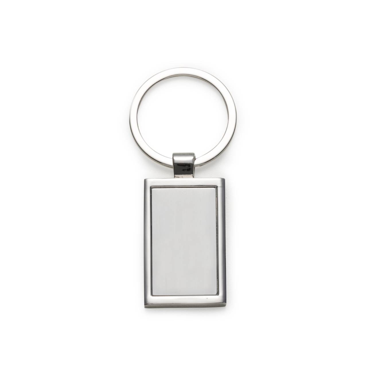 Descrição: Chaveiro de metal retangular com chapa central, verso liso.