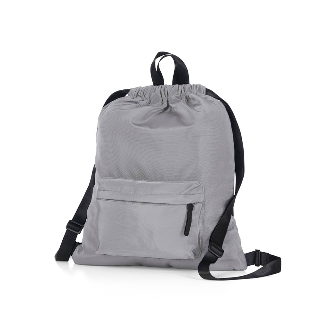 Descrição: Mochila saco em poliéster resistente à água com bolso frontal. A mochila possui duas alças de mãos e área costada antitranspirante.