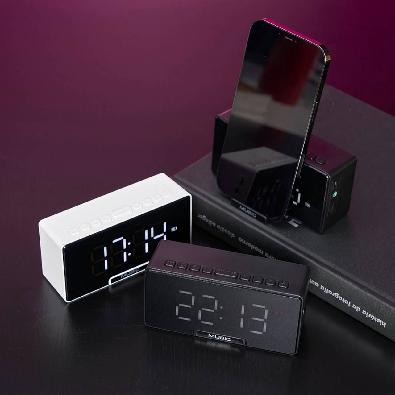 Descrição: Caixa de som multimídia com relógio despertador e suporte para celular. Produzida em plástico e com borrachas antiderrapantes na área inferior, a caixa de som tem a área frontal com display de LED, além de um compartimento com suporte para celular – uma espécie de “gaveta” aonde é exibido (MUSIC), basta puxá-la ter acesso ao compartimento. A caixa de som executa nos modos bluetooth, cartão TF-microSD e entrada auxiliar P2. Acompanha cabo USB e manual em inglês.