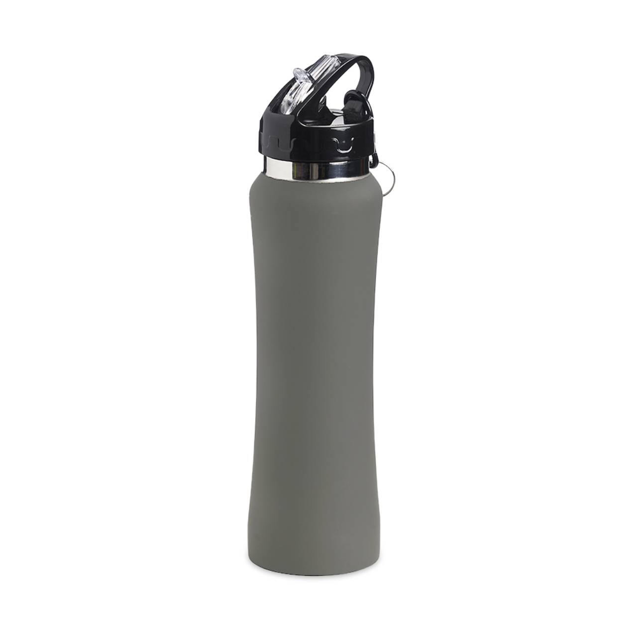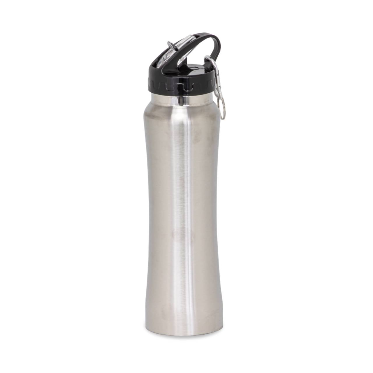Descrição: Squeeze de inox com capacidade de 750ml, tampa plástica com bico de canudo. Acompanha mosquetão.
