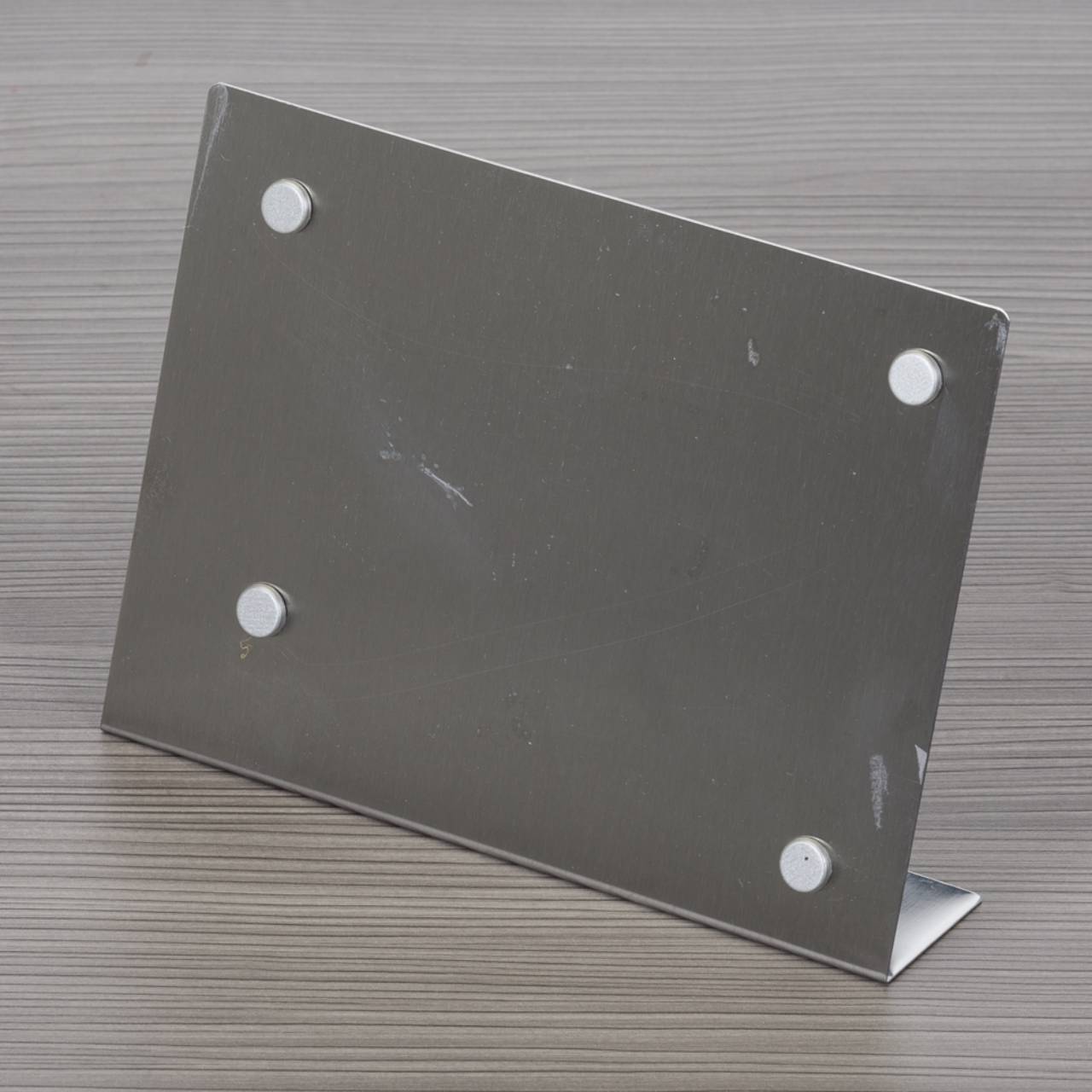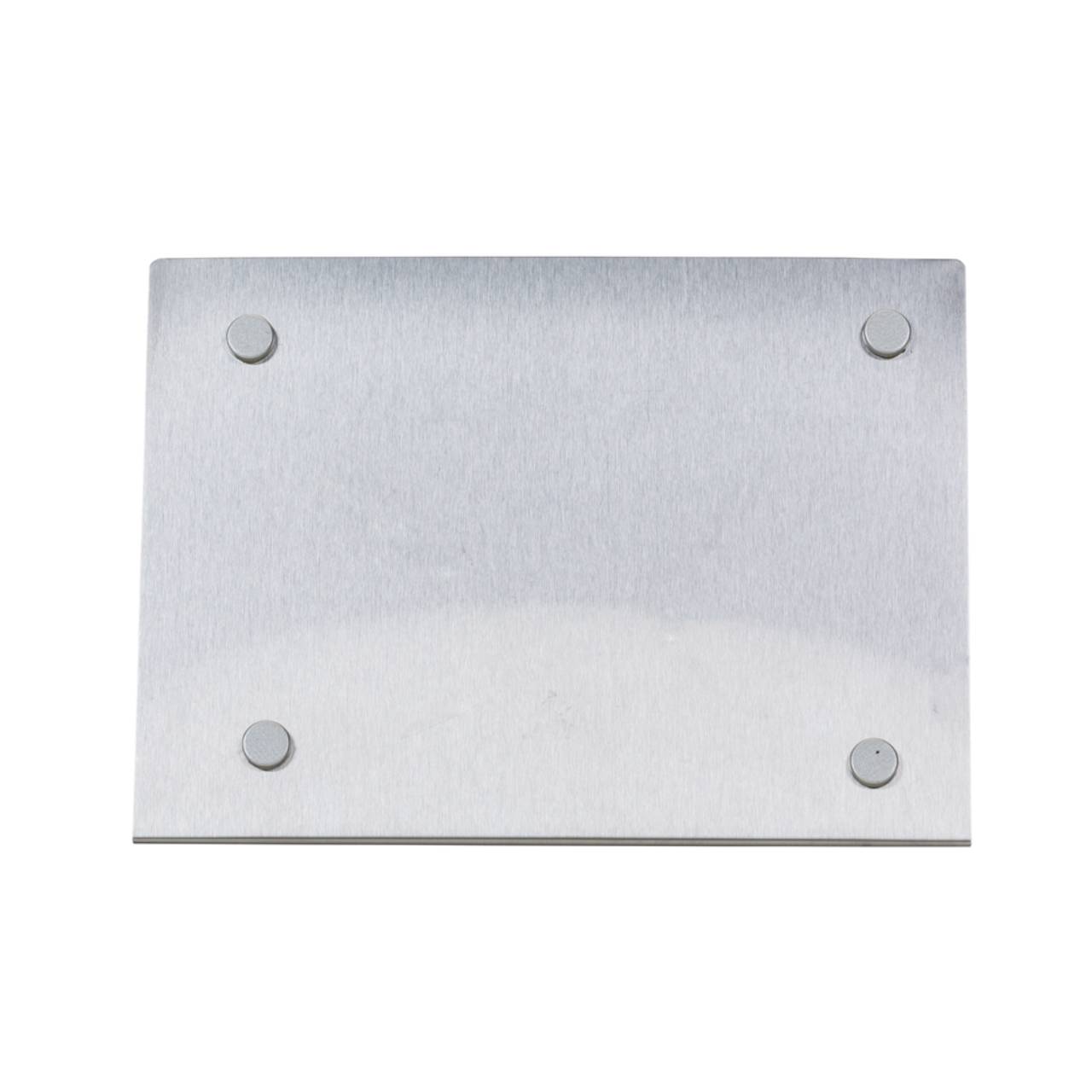 Descrição: Porta retrato 10 x 15 em inox escovado, modelo chapa metálica acompanha quatro “botões” imã e película protetora anti-risco.