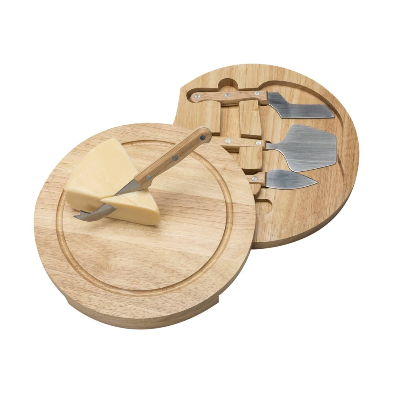 Descrição: Kit queijo 5 peças, possui tábua de bambu com detalhe circular em relevo na parte superior e parte inferior com borrachas antideslizantes. Contém faca reta, espátula, faca com ponta e garfo em inox. Para abrir basta rotacionar a tampa.