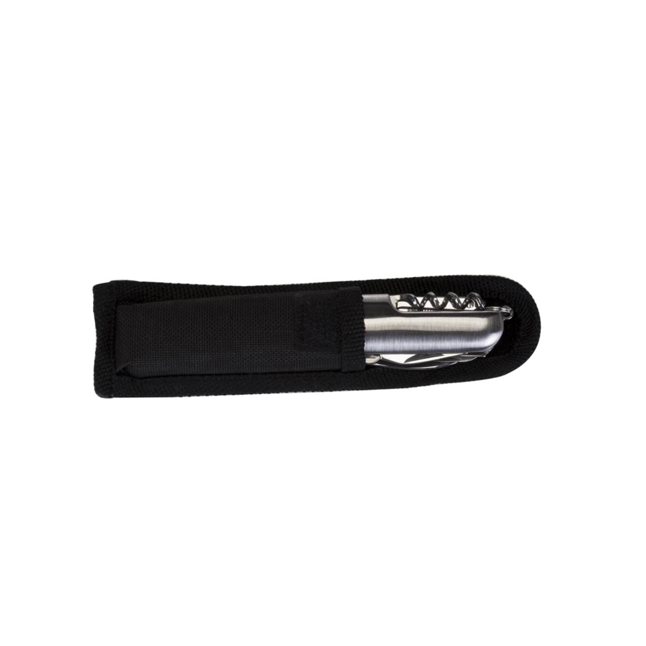 Descrição: Canivete metal 11 funções com detalhes emborrachados preto(três linhas frente e verso). Possui: lâmina de corte, serrilha, serra madeira, mini tesoura, abridor de latas, abridor de garrafa, chave phillips, lamina de remoção e limpeza, lixa, agulha de sutura e saca-rolhas. Acompanha bainha em nylon.